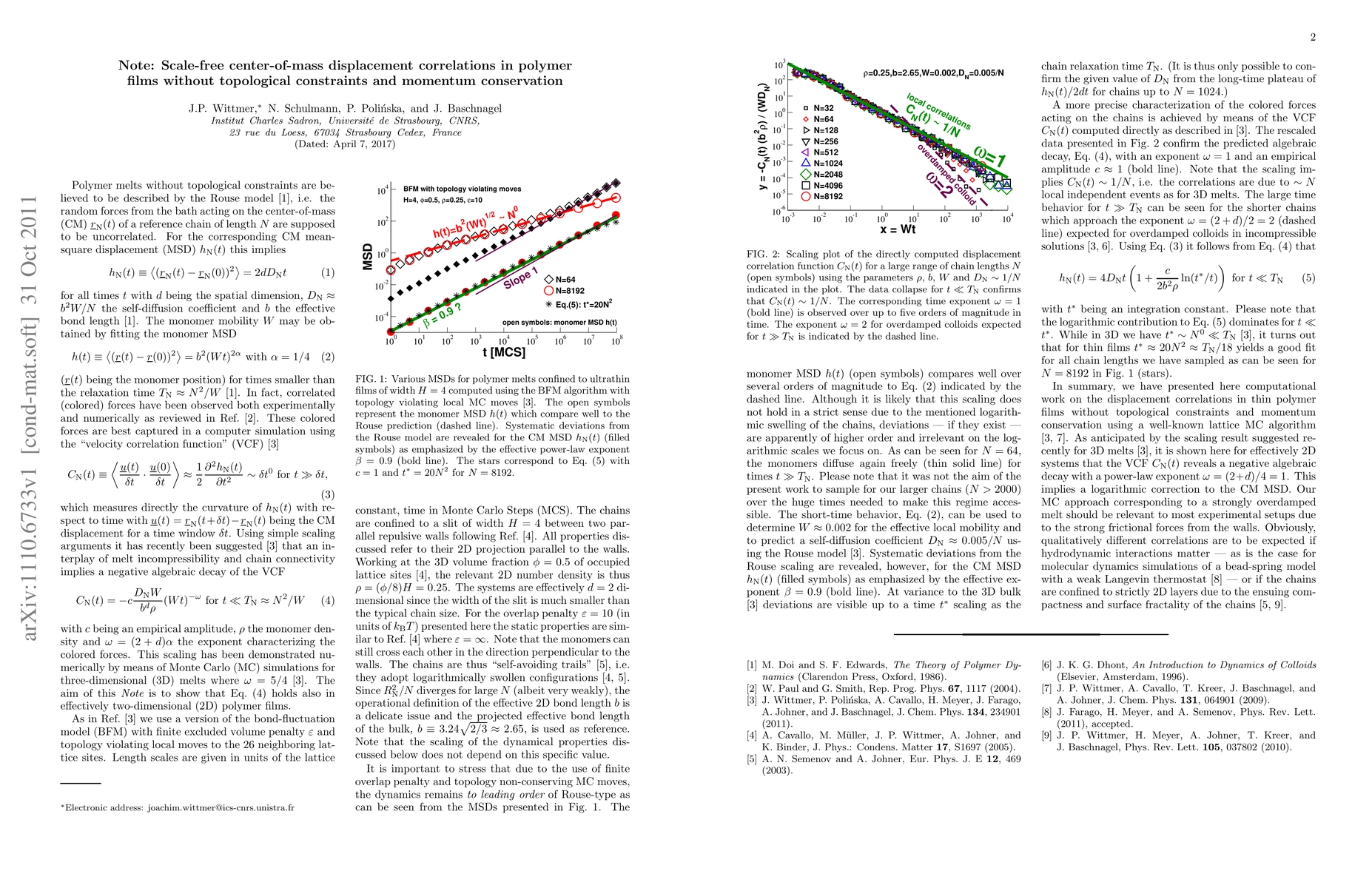 We present here computational work on the center-of-mass displacements in thin polymer films of finite width without topological constraints and without momentum conservation obtained using a well-known lattice Monte Carlo algorithm with chain lengths ranging up to N=8192. Computing directly the center-of-mass displacement correlation function C_N(t) allows to make manifest the existence of scale-free colored forces acting on a reference chain. As suggested by the scaling arguments put forward in a recent work on three-dimensional melts, we obtain a negative algebraic decay C_N(t) \sim -1/(Nt) for times t << T_N with T_N being the chain relaxation time. This implies a logarithmic correction to the related center-of-mass mean square-displacement h_N(t) as has been checked directly.