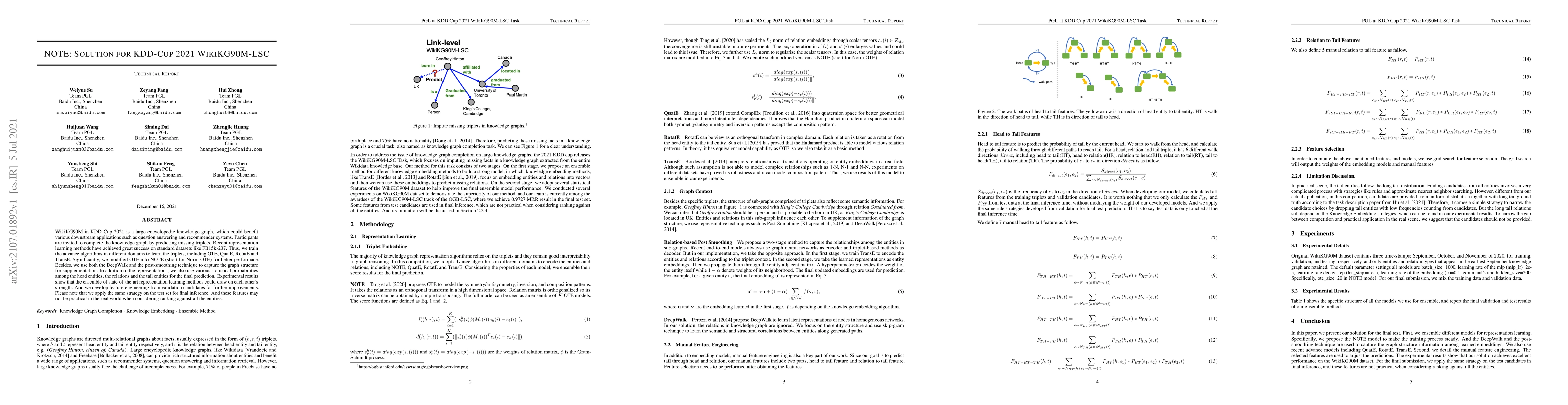 WikiKG90M in KDD Cup 2021 is a large encyclopedic knowledge graph, which could benefit various downstream applications such as question answering and recommender systems. Participants are invited to complete the knowledge graph by predicting missing triplets. Recent representation learning methods have achieved great success on standard datasets like FB15k-237. Thus, we train the advanced algorithms in different domains to learn the triplets, including OTE, QuatE, RotatE and TransE. Significantly, we modified OTE into NOTE (short for Norm-OTE) for better performance. Besides, we use both the DeepWalk and the post-smoothing technique to capture the graph structure for supplementation. In addition to the representations, we also use various statistical probabilities among the head entities, the relations and the tail entities for the final prediction. Experimental results show that the ensemble of state-of-the-art representation learning methods could draw on each others strengths. And we develop feature engineering from validation candidates for further improvements. Please note that we apply the same strategy on the test set for final inference. And these features may not be practical in the real world when considering ranking against all the entities.