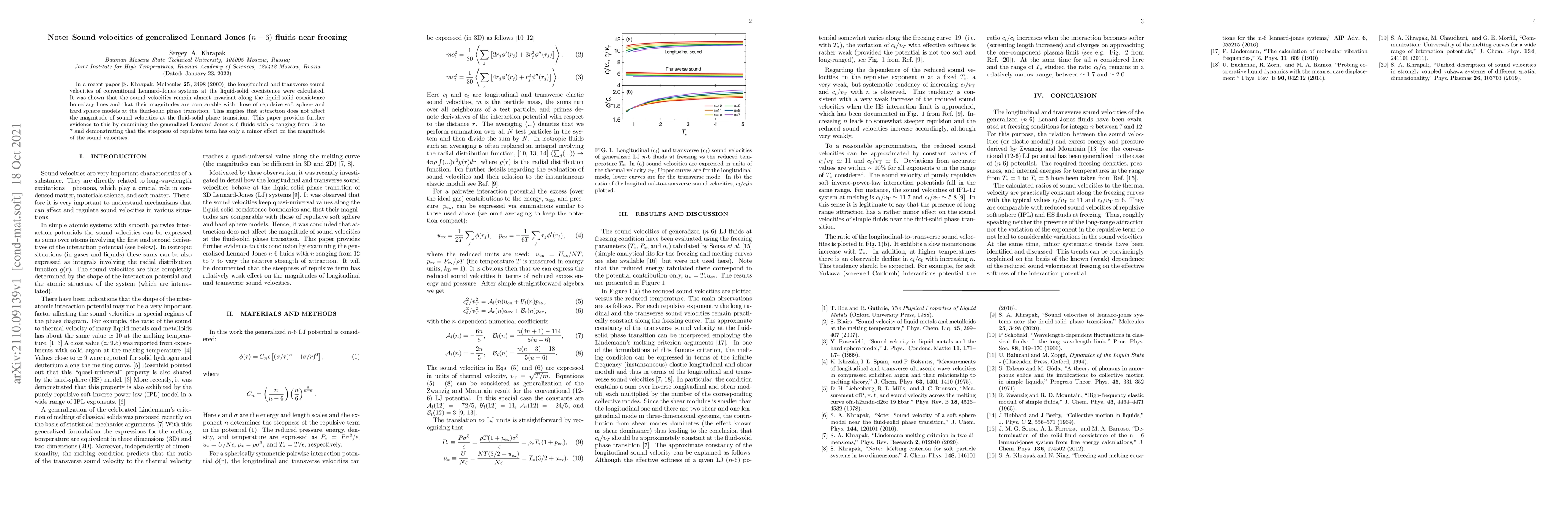 In a recent paper [S. Khrapak, Molecules {\bf 25}, 3498 (2000)] the longitudinal and transverse sound velocities of conventional Lennard-Jones systems at the liquid-solid coexistence were calculated. It was shown that the sound velocities remain almost invariant along the liquid-solid coexistence boundary lines and that their magnitudes are comparable with those of repulsive soft sphere and hard sphere models at the fluid-solid phase transition. This implies that attraction does not affect the magnitude of sound velocities at the fluid-solid phase transition. This paper provides further evidence to this by examining the generalized Lennard-Jones $n$-6 fluids with $n$ ranging from $12$ to $7$ and demonstrating that the steepness of repulsive term has only a minor effect on the magnitude of the sound velocities.