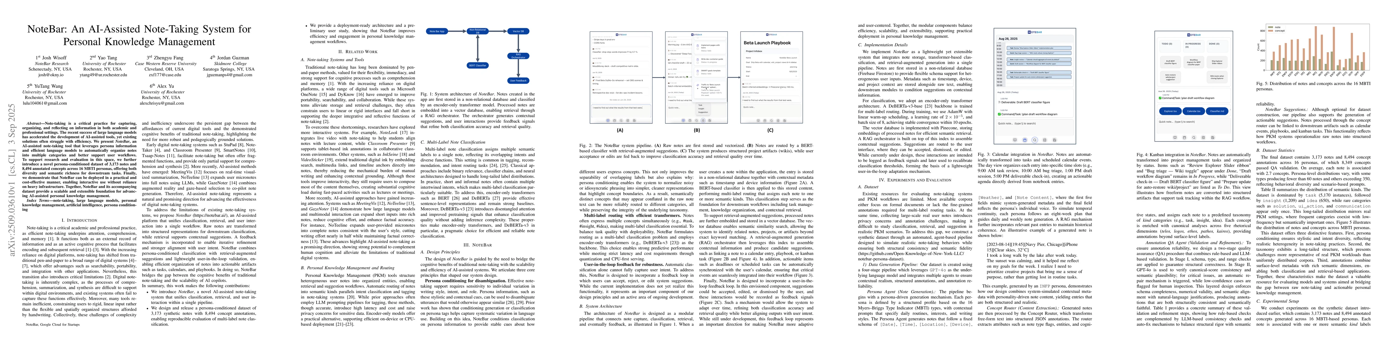 Note-taking is a critical practice for capturing, organizing, and reflecting on information in both academic and professional settings. The recent success of large language models has accelerated the development of AI-assisted tools, yet existing solutions often struggle with efficiency. We present NoteBar, an AI-assisted note-taking tool that leverages persona information and efficient language models to automatically organize notes into multiple categories and better support user workflows. To support research and evaluation in this space, we further introduce a novel persona-conditioned dataset of 3,173 notes and 8,494 annotated concepts across 16 MBTI personas, offering both diversity and semantic richness for downstream tasks. Finally, we demonstrate that NoteBar can be deployed in a practical and cost-effective manner, enabling interactive use without reliance on heavy infrastructure. Together, NoteBar and its accompanying dataset provide a scalable and extensible foundation for advancing AI-assisted personal knowledge management.