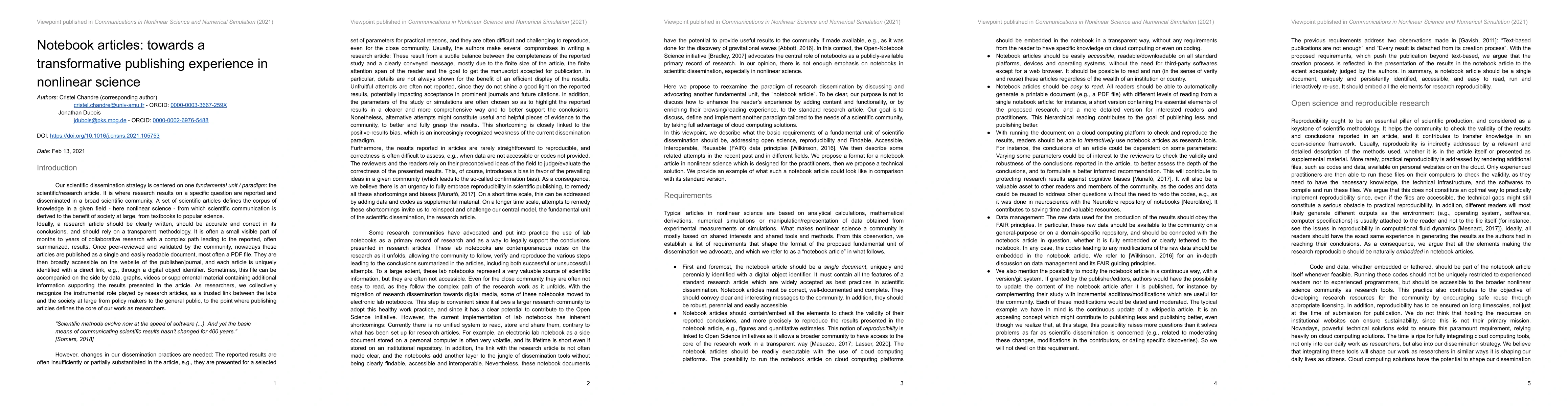 Open Science, Reproducible Research, Findable, Accessible, Interoperable and Reusable (FAIR) data principles are long term goals for scientific dissemination. However, the implementation of these principles calls for a reinspection of our means of dissemination. In our viewpoint, we discuss and advocate, in the context of nonlinear science, how a notebook article represents an essential step toward this objective by fully embracing cloud computing solutions. Notebook articles as scholar articles offer an alternative, efficient and more ethical way to disseminate research through their versatile environment. This format invites the readers to delve deeper into the reported research. Through the interactivity of the notebook articles, research results such as for instance equations and figures are reproducible even for non-expert readers. The codes and methods are available, in a transparent manner, to interested readers. The methods can be reused and adapted to answer additional questions in related topics. The codes run on cloud computing services, which provide easy access, even to low-income countries and research groups. The versatility of this environment provides the stakeholders - from the researchers to the publishers - with opportunities to disseminate the research results in innovative ways.