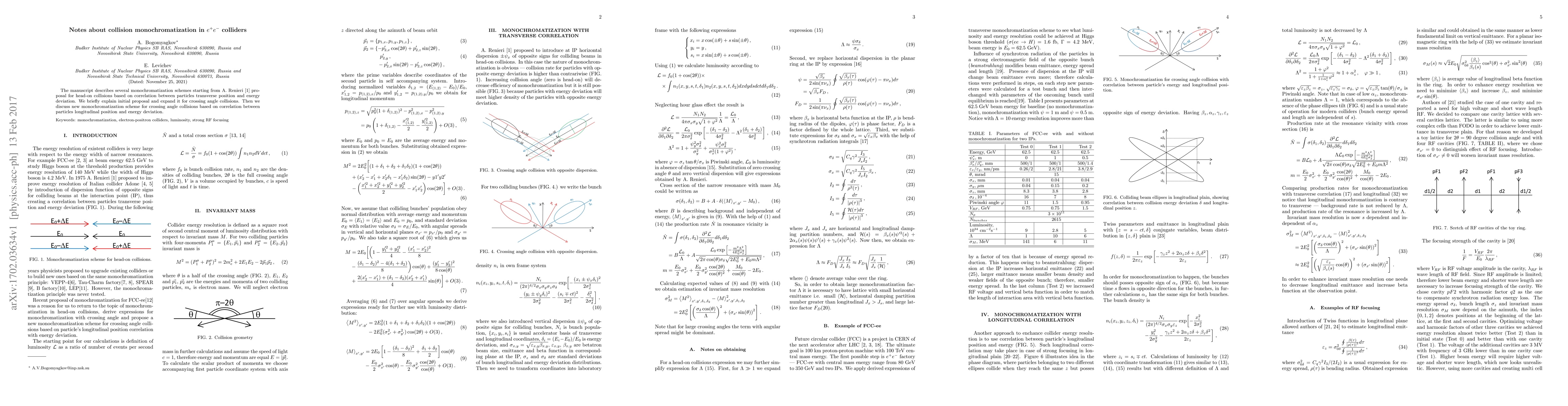 The manuscript describes several monochromatization schemes starting from A.~Renieri \cite{ref:Renieri} proposal for head-on collisions based on correlation between particles transverse position and energy deviation. We briefly explain initial proposal and expand it for crossing angle collisions. Then we discuss new monochromatization scheme for crossing angle collisions based on correlation between particles longitudinal position and energy deviation.