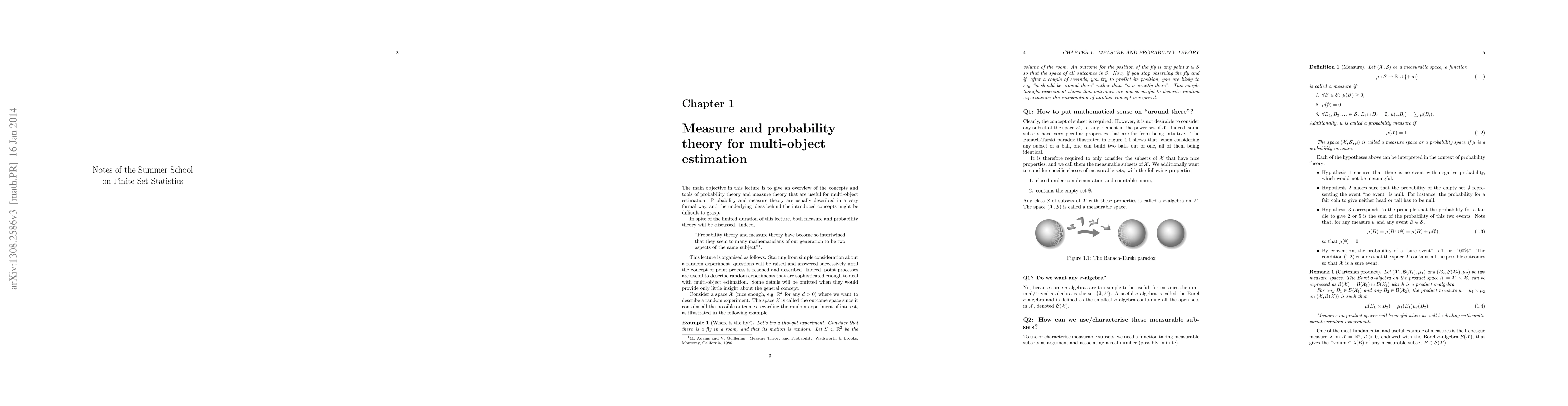 This document contains the notes of some of the lectures given at the first summer school on Finite Set Statistics held in Edinburgh from July 22, 2013 to July 26, 2013. The notes are mostly self contained and are accessible to everyone.