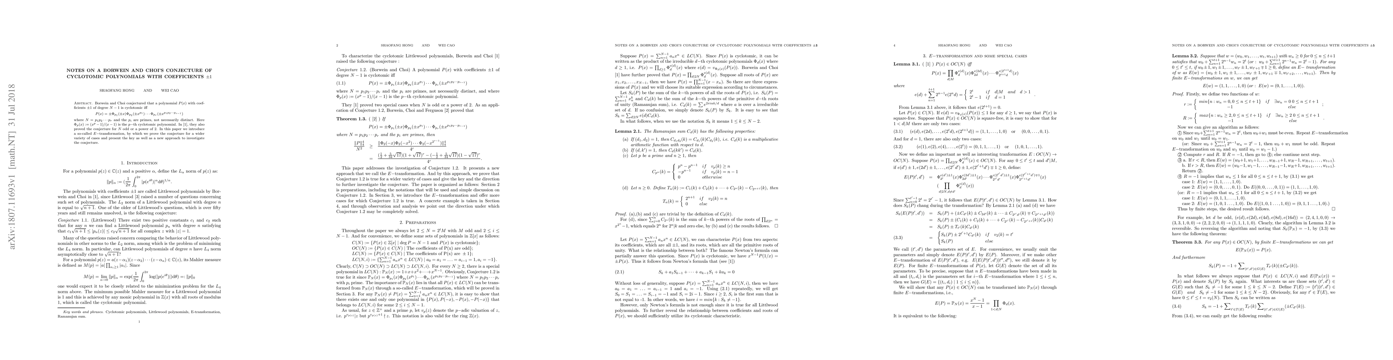Borwein and Choi conjectured that a polynomial $P(x)$ with coefficients $\pm1$ of degree $N-1$ is cyclotomic iff $$P(x)=\pm \Phi_{p_1}(\pm x)\Phi_{p_2}(\pm x^{p_1})\cdots \Phi_{p_r}(\pm x^{p_1p_2\cdots p_{r-1}})$$ where $N=p_1p_2\cdots p_{r}$ and the $p_i$ are primes, not necessarily distinct. Here $\Phi_p(x):=(x^p-1)/(x-1)$ is the $p-$th cyclotomic polynomial. In \cite{1}, they also proved the conjecture for $N$ odd or a power of 2. In this paper we introduce a so-called $E-$transformation, by which we prove the conjecture for a wider variety of cases and present the key as well as a new approach to investigate the conjecture.