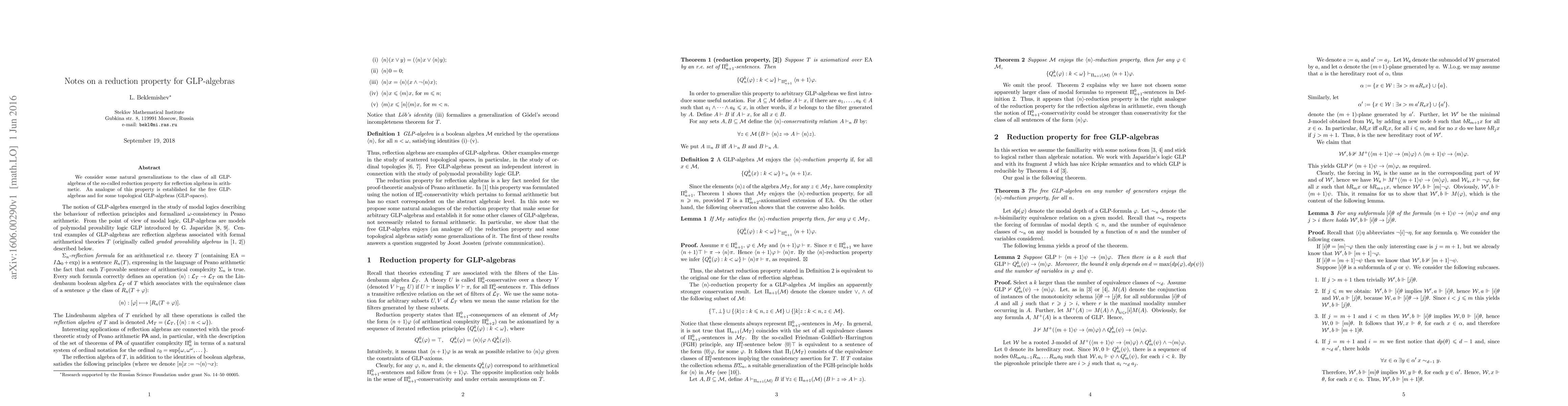 We consider some natural generalizations to the class of all GLP-algebras of the so-called reduction property for reflection algebras in arithmetic. An analogue of this property is established for the free GLP-algebras and for some topological GLP-algebras (GLP-spaces).
