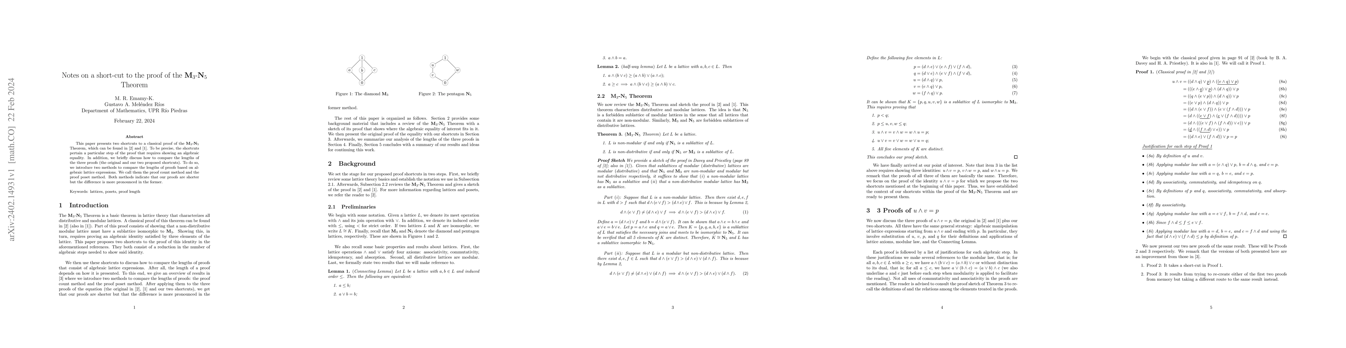 This paper presents two shortcuts to a classical proof of the $\mathbf{M}_3$-$\mathbf{N}_5$ Theorem, which can be found in B. Davey and H. Priestley [2] and S. Burris and H. Sankappanavar [1]. To be precise, the shortcuts pertain a particular step of the proof that requires showing an algebraic equality. In addition, we briefly discuss how to compare the lengths of the three proofs (the original and our two proposed shortcuts). To do so, we introduce two methods to compare the lengths of proofs based on algebraic lattice expressions. We call them the proof count method and the proof poset method. Both methods indicate that our proofs are shorter but the difference is more pronounced in the former. Keywords: lattices, posets