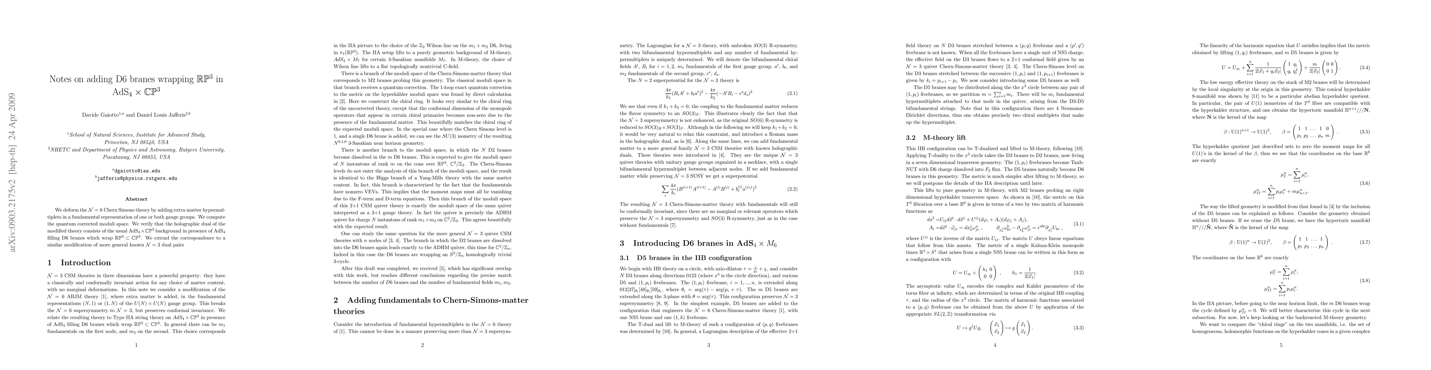 This paper studies the deformation of N=6 Chern Simons theory by introducing fundamental representation hypermultiplets, computes the quantum corrected moduli space, and verifies that the holographic dual involves AdS4 x CP3 with D6 branes wrapping RP3 in CP3. It extends these findings to similar modifications in other N=3 dual pairs.