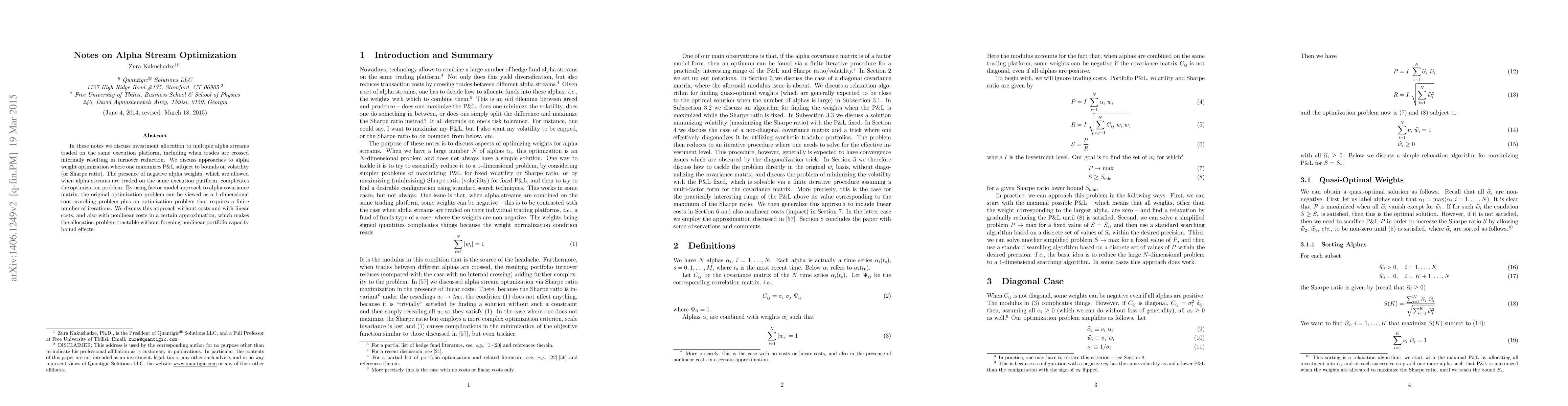 In these notes we discuss investment allocation to multiple alpha streams traded on the same execution platform, including when trades are crossed internally resulting in turnover reduction. We discuss approaches to alpha weight optimization where one maximizes P&L subject to bounds on volatility (or Sharpe ratio). The presence of negative alpha weights, which are allowed when alpha streams are traded on the same execution platform, complicates the optimization problem. By using factor model approach to alpha covariance matrix, the original optimization problem can be viewed as a 1-dimensional root searching problem plus an optimization problem that requires a finite number of iterations. We discuss this approach without costs and with linear costs, and also with nonlinear costs in a certain approximation, which makes the allocation problem tractable without forgoing nonlinear portfolio capacity bound effects.