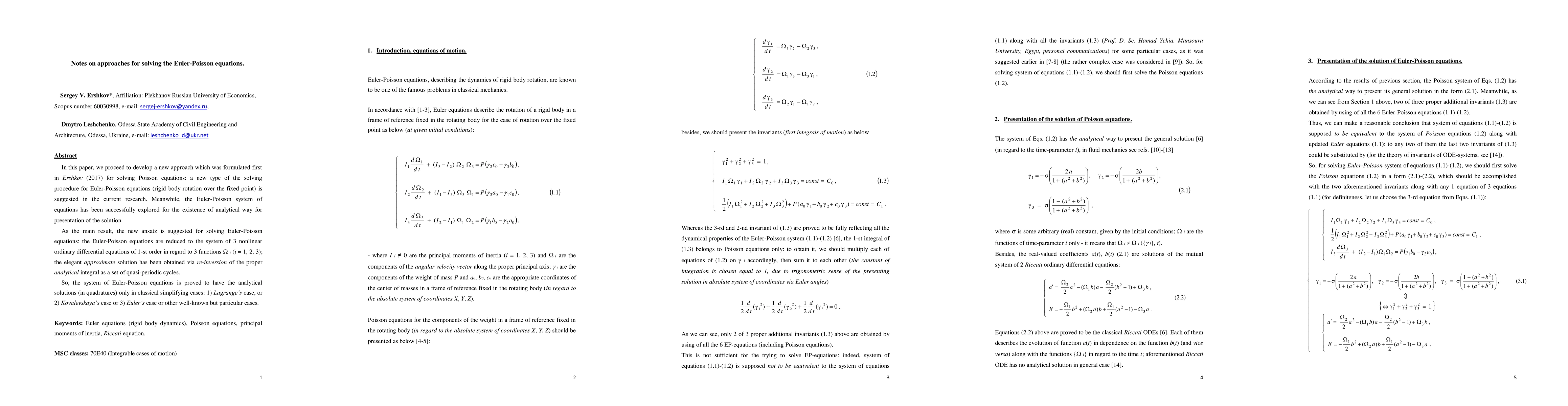In this paper, we proceed to develop a new approach which was formulated first in Ershkov (2017) for solving Poisson equations: a new type of the solving procedure for Euler-Poisson equations (rigid body rotation over the fixed point) is suggested in the current research. Meanwhile, the Euler-Poisson system of equations has been successfully explored for the existence of analytical way for presentation of the solution. As the main result, the new ansatz is suggested for solving Euler-Poisson equations: the Euler-Poisson equations are reduced to the system of 3 nonlinear ordinary differential equations of 1-st order in regard to 3 functions; the elegant approximate solution has been obtained via re-inversion of the proper analytical integral as a set of quasi-periodic cycles. So, the system of Euler-Poisson equations is proved to have the analytical solutions (in quadratures) only in classical simplifying cases: 1) Lagrange case, or 2) Kovalevskaya case or 3) Euler case or other well-known but particular cases.