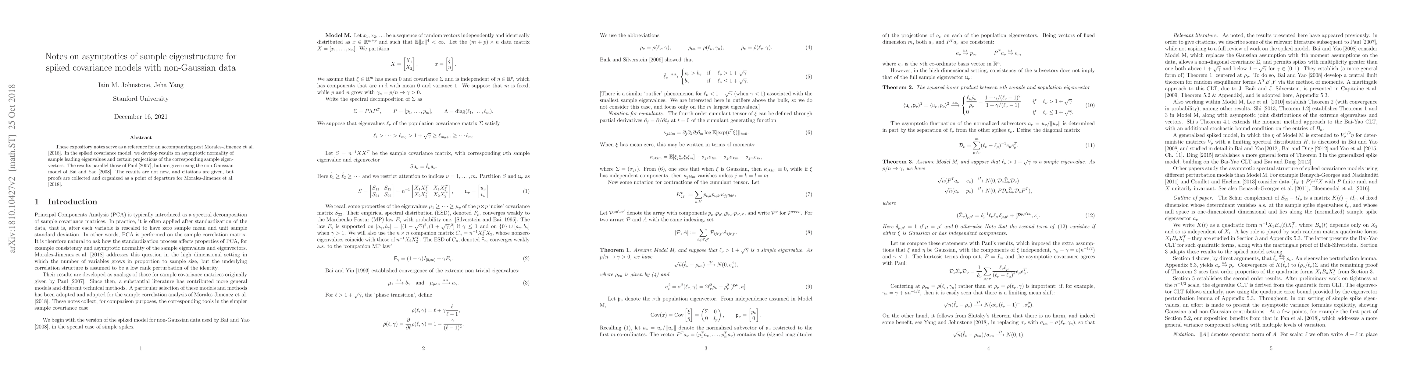 These expository notes serve as a reference for an accompanying post Morales-Jimenez et al. [2018]. In the spiked covariance model, we develop results on asymptotic normality of sample leading eigenvalues and certain projections of the corresponding sample eigenvectors. The results parallel those of Paul [2007], but are given using the non-Gaussian model of Bai and Yao [2008]. The results are not new, and citations are given, but proofs are collected and organized as a point of departure for Morales-Jimenez et al. [2018].
