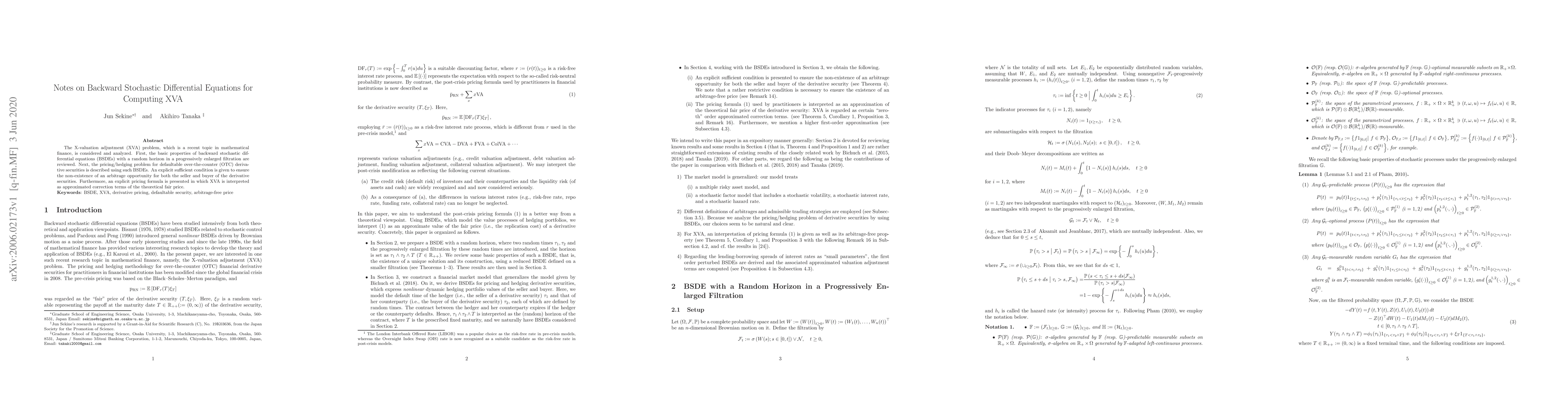 The X-valuation adjustment (XVA) problem, which is a recent topic in mathematical finance, is considered and analyzed. First, the basic properties of backward stochastic differential equations (BSDEs) with a random horizon in a progressively enlarged filtration are reviewed. Next, the pricing/hedging problem for defaultable over-the-counter (OTC) derivative securities is described using such BSDEs. An explicit sufficient condition is given to ensure the non-existence of an arbitrage opportunity for both the seller and buyer of the derivative securities. Furthermore, an explicit pricing formula is presented in which XVA is interpreted as approximated correction terms of the theoretical fair price.