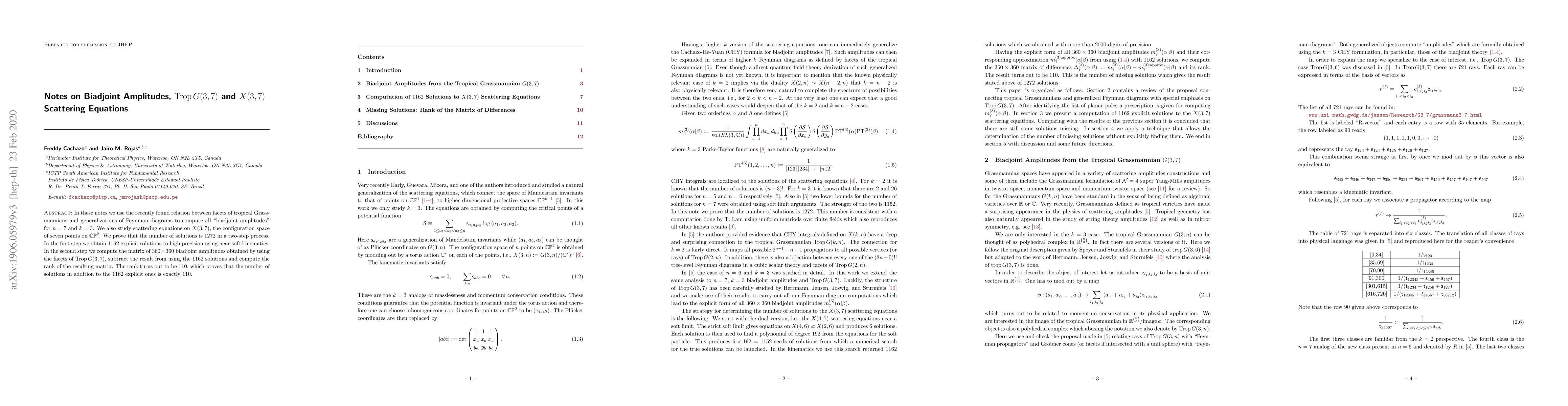 In these notes we use the recently found relation between facets of tropical Grassmannians and generalizations of Feynman diagrams to compute all "biadjoint amplitudes" for $n=7$ and $k=3$. We also study scattering equations on $X(3,7)$, the configuration space of seven points on $\mathbb{CP}^2$. We prove that the number of solutions is $1272$ in a two-step process. In the first step we obtain $1162$ explicit solutions to high precision using near-soft kinematics. In the second step we compute the matrix of $360\times 360$ biadjoint amplitudes obtained by using the facets of ${\rm Trop}\, G(3,7)$, subtract the result from using the $1162$ solutions and compute the rank of the resulting matrix. The rank turns out to be $110$, which proves that the number of solutions in addition to the $1162$ explicit ones is exactly $110$.