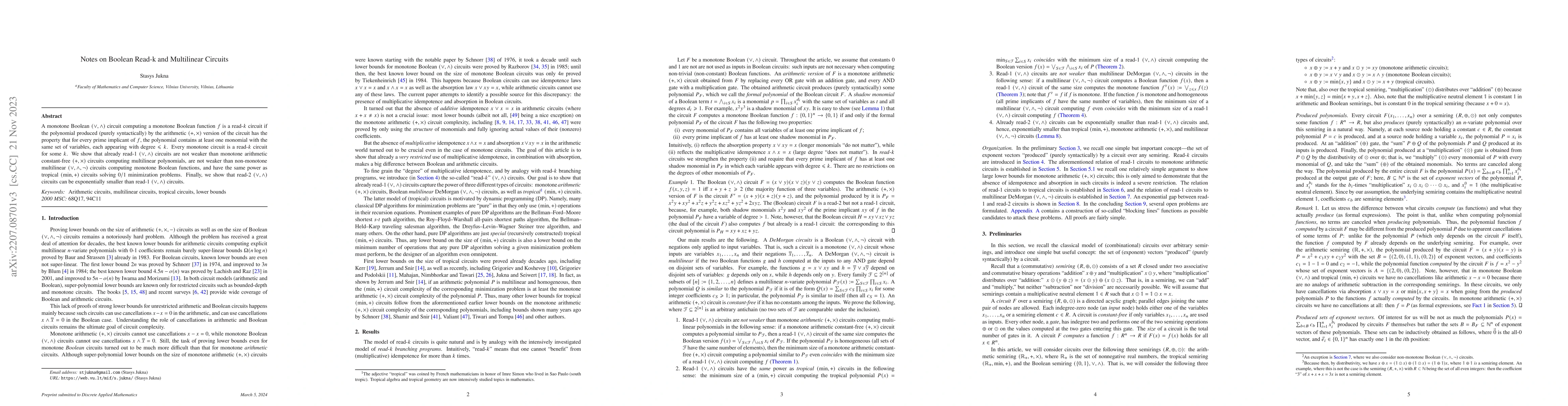 This paper explores the relationship between read-k monotone Boolean circuits and multilinear arithmetic circuits, demonstrating that read-1 circuits are as powerful as non-monotone multilinear circuits and tropical circuits. It also highlights that read-2 circuits can be exponentially smaller than read-1 circuits.