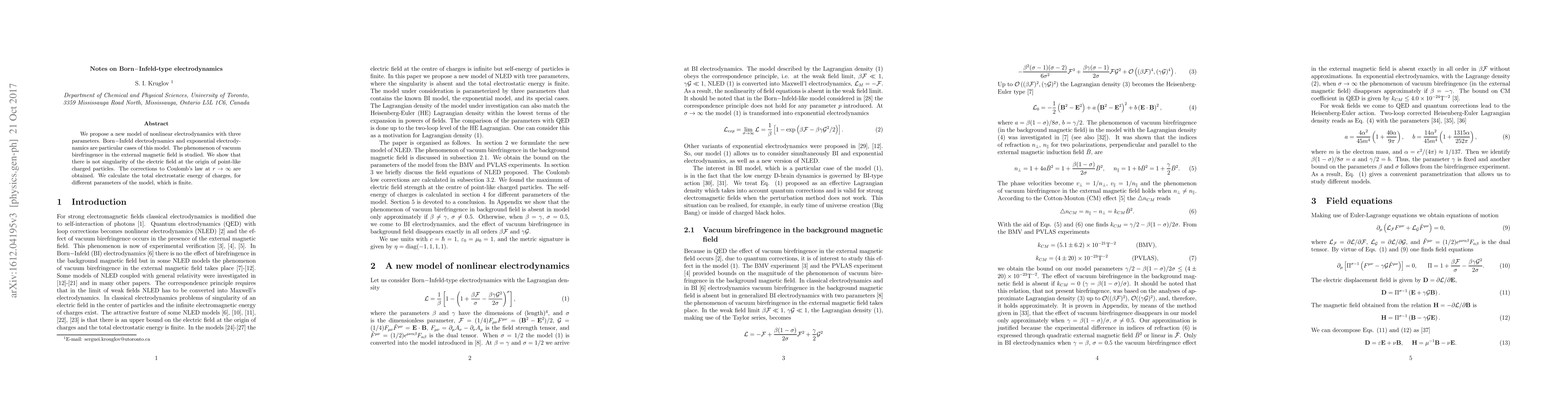 This paper proposes a new three-parameter nonlinear electrodynamics model encompassing Born-Infeld and exponential electrodynamics. It examines vacuum birefringence and demonstrates finite electrostatic energy without electric field singularities at point-like charges.