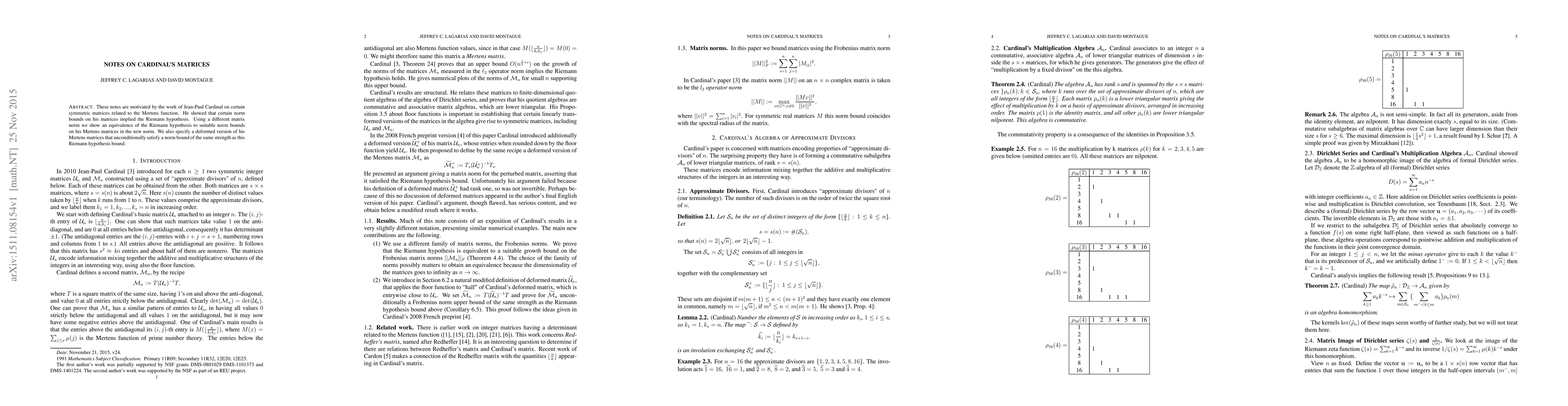 The paper introduces a novel norm for Cardinal's matrices and demonstrates an equivalence between the Riemann Hypothesis and norm bounds on these matrices, along with providing a deformed matrix version that satisfies a strong norm bound unconditionally.