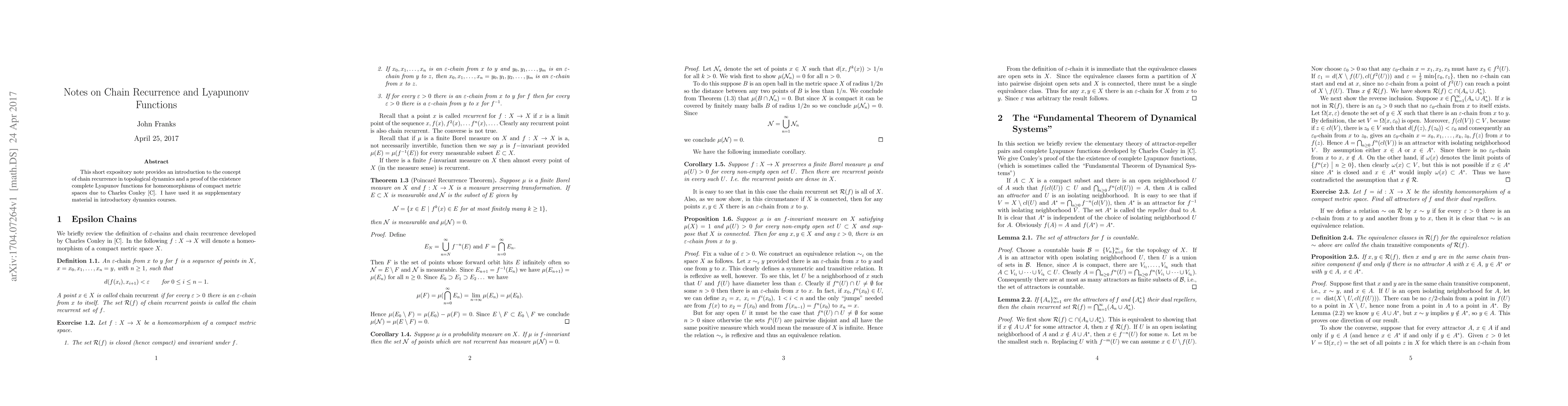 Summary: This paper introduces chain recurrence in topological dynamics and presents Charles Conley's proof of the existence of complete Lyapunov functions for homeomorphisms in compact metric spaces, serving as supplementary material for introductory dynamics courses.