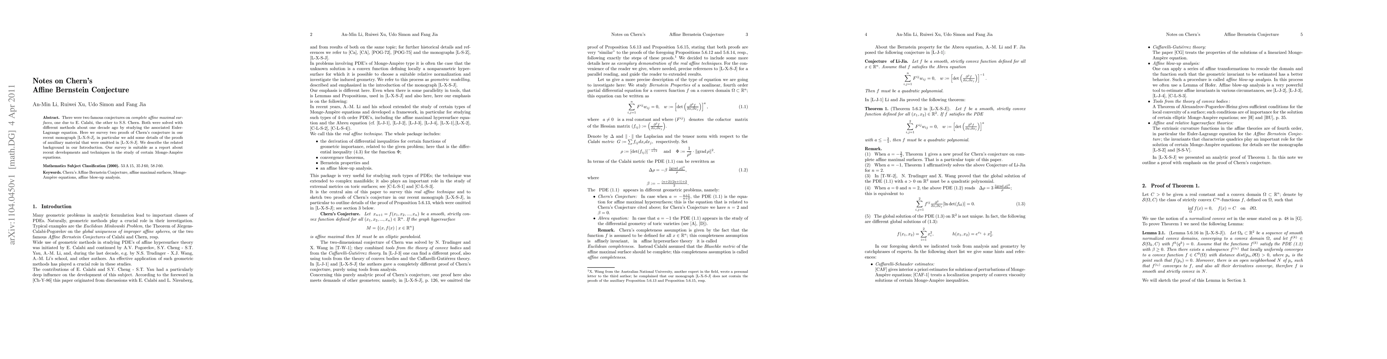 There were two famous conjectures on complete affine maximal surfaces, one due to E. Calabi, the other to S.S. Chern. Both were solved with different methods about one decade ago by studying the associated Euler-Lagrange equation. Here we survey two proofs of Chern's conjecture in our recent monograph [L-X-S-J], in particular we add some details of the proofs of auxiliary material that were omitted in [L-X-S-J]. We describe the related background in our Introduction. Our survey is suitable as a report about recent developments and techniques in the study of certain Monge-Ampere equations.