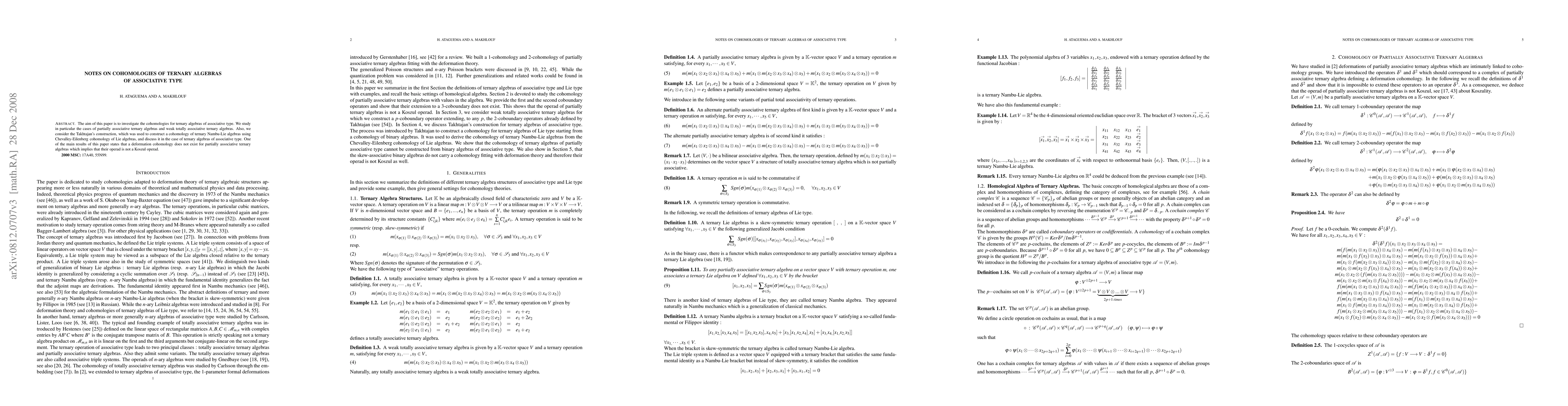 The work extends Takhtajan's construction to ternary algebras of associative type, providing new insights into their cohomology structures and distinguishing between partially associative and totally associative cases.