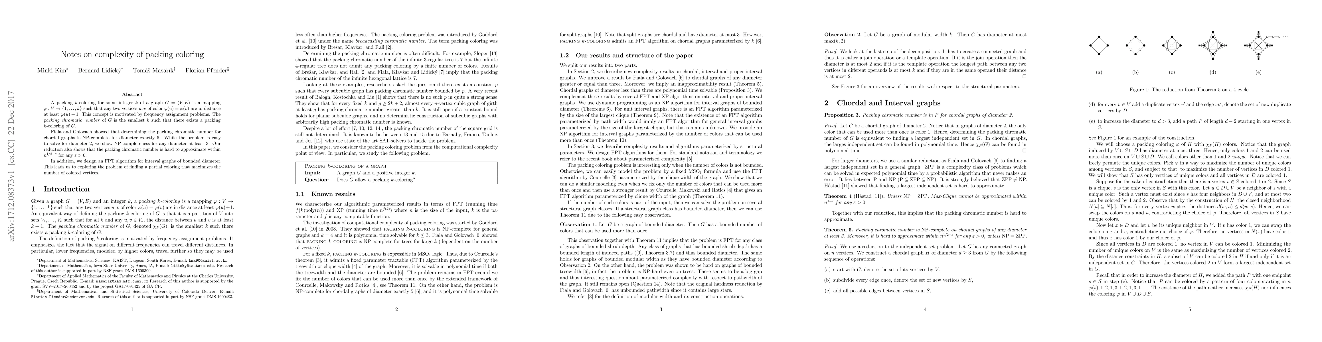 A packing $k$-coloring for some integer $k$ of a graph $G=(V,E)$ is a mapping $\varphi:V\to\{1,\ldots,k\}$ such that any two vertices $u, v$ of color $\varphi(u)=\varphi(v)$ are in distance at least $\varphi(u)+1$. This concept is motivated by frequency assignment problems. The \emph{packing chromatic number} of $G$ is the smallest $k$ such that there exists a packing $k$-coloring of $G$. Fiala and Golovach showed that determining the packing chromatic number for chordal graphs is \NP-complete for diameter exactly 5. While the problem is easy to solve for diameter 2, we show \NP-completeness for any diameter at least 3. Our reduction also shows that the packing chromatic number is hard to approximate within $n^{{1/2}-\varepsilon}$ for any $\varepsilon > 0$. In addition, we design an \FPT algorithm for interval graphs of bounded diameter. This leads us to exploring the problem of finding a partial coloring that maximizes the number of colored vertices.