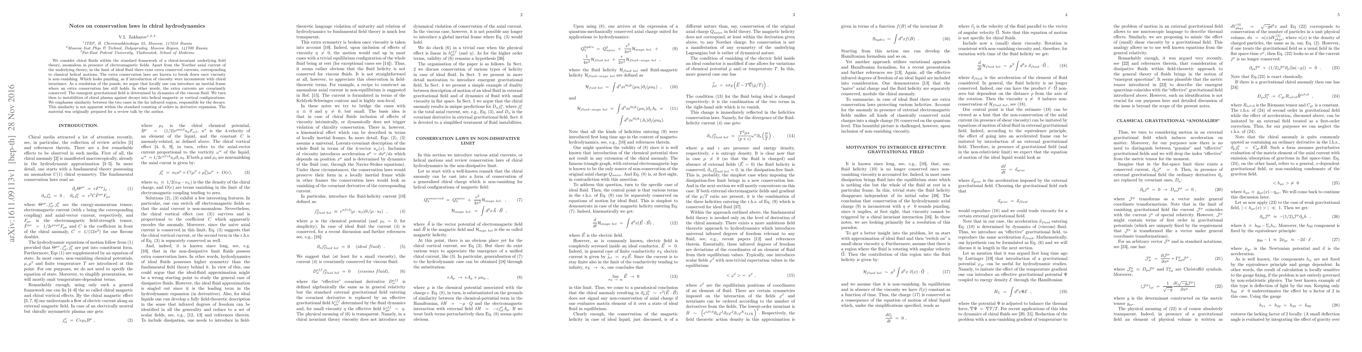 We consider chiral fluids within the standard framework of a chiral-invariant underlying field theory, anomalous in presence of electromagnetic fields. Apart from the Noether axial current of the underlying theory, in the limit of ideal fluid there exist extra conserved currents, corresponding to classical helical motions. The extra conservation laws are known to break down once viscosity is non-vanishing. Which looks puzzling, as if introduction of viscosity were inconsistent with chiral invariance. As a resolution of the puzzle, we argue that locally one can introduce an inertial frame where an extra conservation law still holds. In other words, the extra currents are covariantly conserved. The emergent gravitational field is determined by dynamics of the viscous fluid. We turn then to instabilities of chiral plasma against decays into helical magnetic or vortical configurations. We emphasise similarity between the two cases in the far infrared region, responsible for the decays. This similarity is not apparent within the standard counting of orders in derivative expansion. The material was originally prepared for a review talk by the author.
