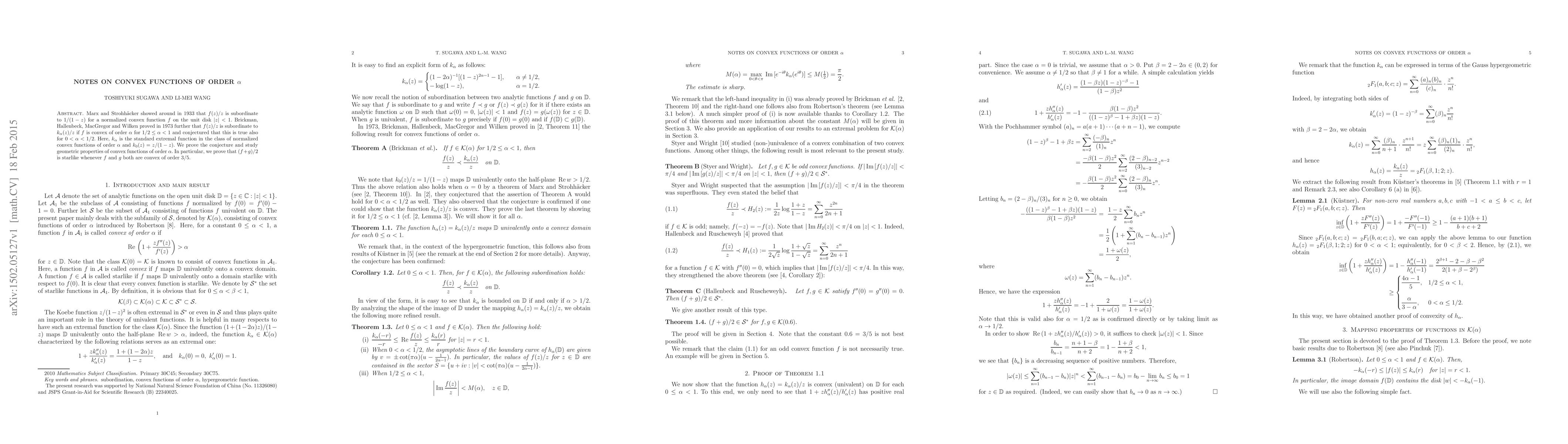 Marx and Strohh\"acker showed around in 1933 that $f(z)/z$ is subordinate to $1/(1-z)$ for a normalized convex function $f$ on the unit disk $|z|<1.$ Brickman, Hallenbeck, MacGregor and Wilken proved in 1973 further that $f(z)/z$ is subordinate to $k_\alpha(z)/z$ if $f$ is convex of order $\alpha$ for $1/2\le\alpha<1$ and conjectured that this is true also for $0<\alpha<1/2.$ Here, $k_\alpha$ is the standard extremal function in the class of normalized convex functions of order $\alpha$ and $k_0(z)=z/(1-z).$ We prove the conjecture and study geometric properties of convex functions of order $\alpha.$ In particular, we prove that $(f+g)/2$ is starlike whenever $f$ and $g$ both are convex of order $3/5.$