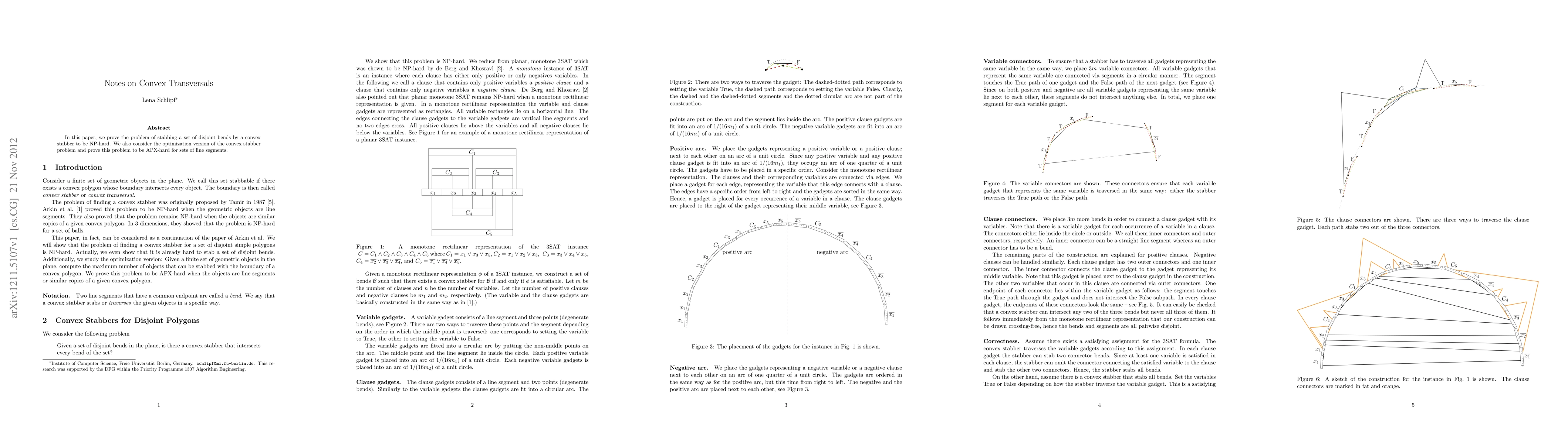 This paper proves the stabbing problem of disjoint bends by a convex stabber to be NP-hard. It also establishes the optimization version of the convex stabber problem as APX-hard for sets of line segments.