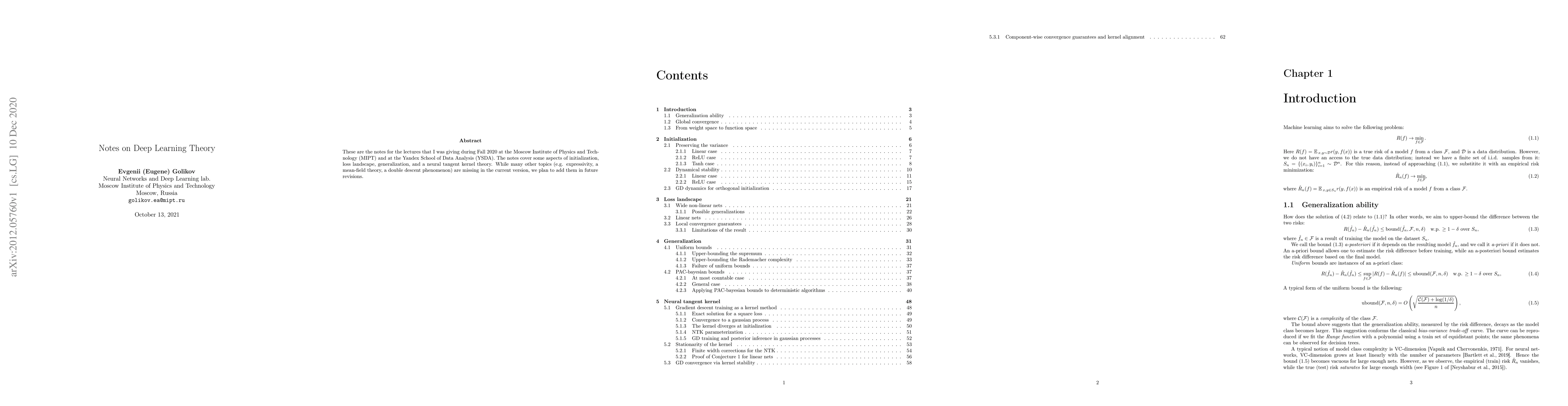 These are the notes for the lectures that I was giving during Fall 2020 at the Moscow Institute of Physics and Technology (MIPT) and at the Yandex School of Data Analysis (YSDA). The notes cover some aspects of initialization, loss landscape, generalization, and a neural tangent kernel theory. While many other topics (e.g. expressivity, a mean-field theory, a double descent phenomenon) are missing in the current version, we plan to add them in future revisions.