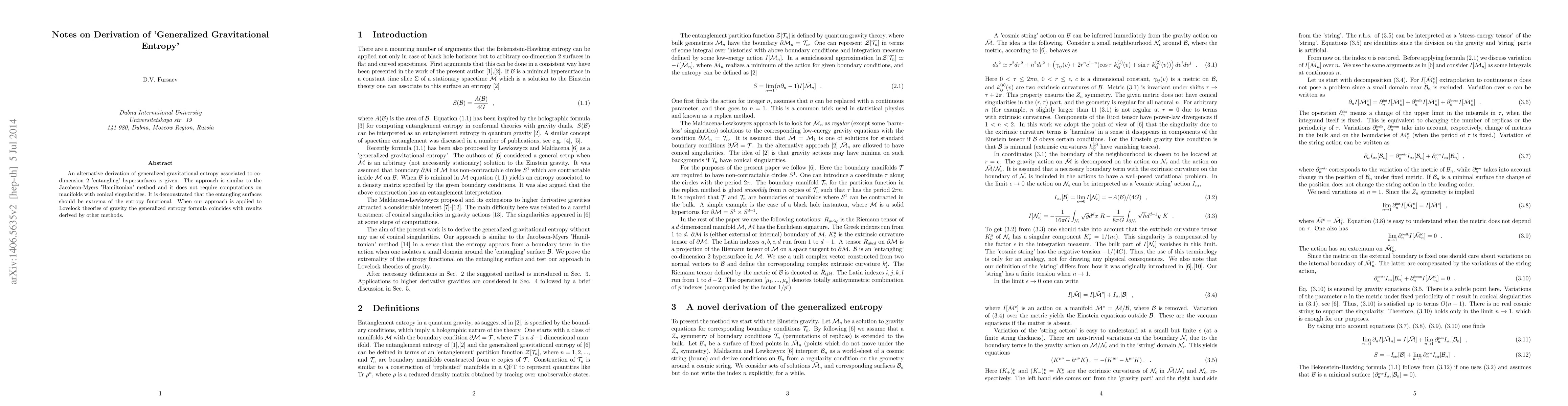 An alternative derivation of generalized gravitational entropy associated to co-dimension 2 'entangling' hypersurfaces is given. The approach is similar to the Jacobson-Myers 'Hamiltonian' method and it does not require computations on manifolds with conical singularities. It is demonstrated that the entangling surfaces should be extrema of the entropy functional. When our approach is applied to Lovelock theories of gravity the generalized entropy formula coincides with results derived by other methods.
