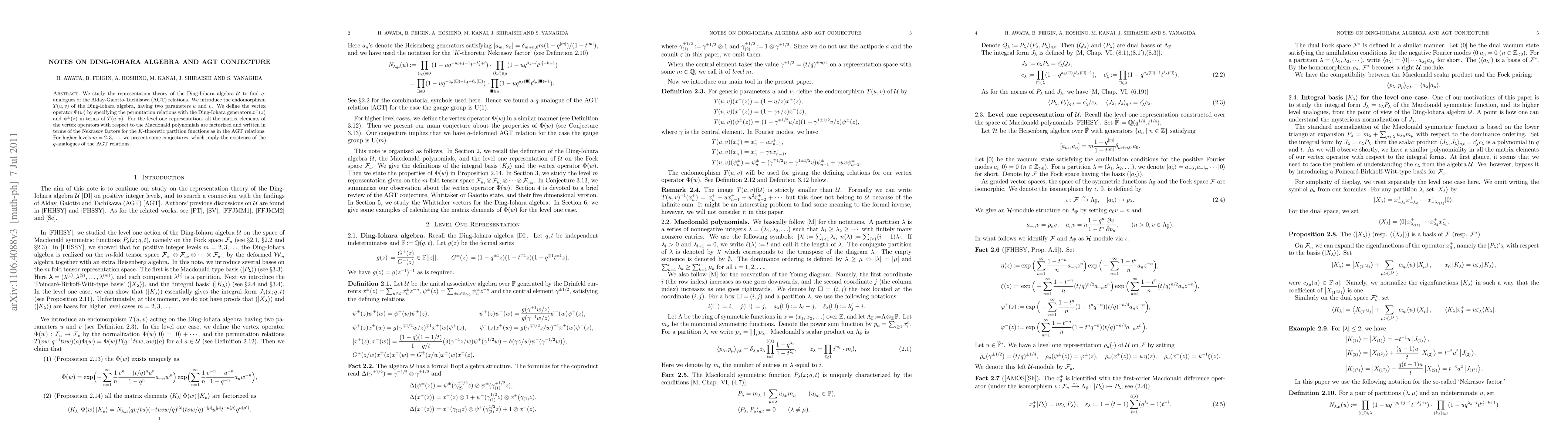 We study the representation theory of the Ding-Iohara algebra $\calU$ to find $q$-analogues of the Alday-Gaiotto-Tachikawa (AGT) relations. We introduce the endomorphism $T(u,v)$ of the Ding-Iohara algebra, having two parameters $u$ and $v$. We define the vertex operator $\Phi(w)$ by specifying the permutation relations with the Ding-Iohara generators $x^\pm(z)$ and $\psi^\pm(z)$ in terms of $T(u,v)$. For the level one representation, all the matrix elements of the vertex operators with respect to the Macdonald polynomials are factorized and written in terms of the Nekrasov factors for the $K$-theoretic partition functions as in the AGT relations. For higher levels $m=2,3,...$, we present some conjectures, which imply the existence of the $q$-analogues of the AGT relations.