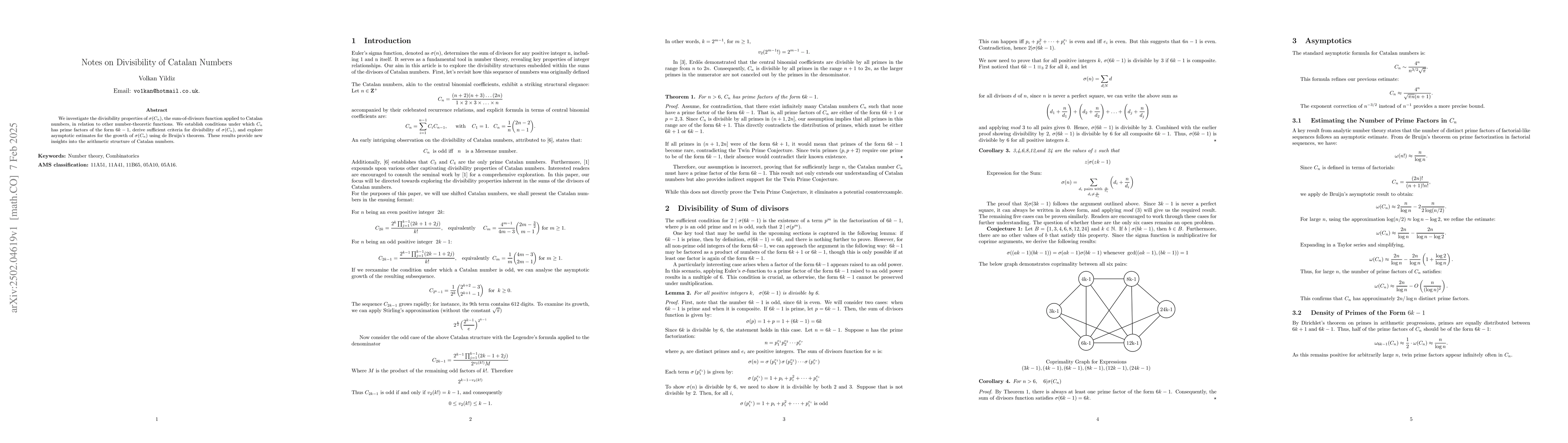 We investigate the divisibility properties of \sigma(C_n), the sum-of-divisors function applied to Catalan numbers, in relation to other number-theoretic functions. We establish conditions under which C_n has prime factors of the form 6k-1, derive sufficient criteria for divisibility of \sigma(C_n), and explore asymptotic estimates for the growth of \sigma(C_n) using de Bruijn's theorem. These results provide new insights into the arithmetic structure of Catalan numbers.