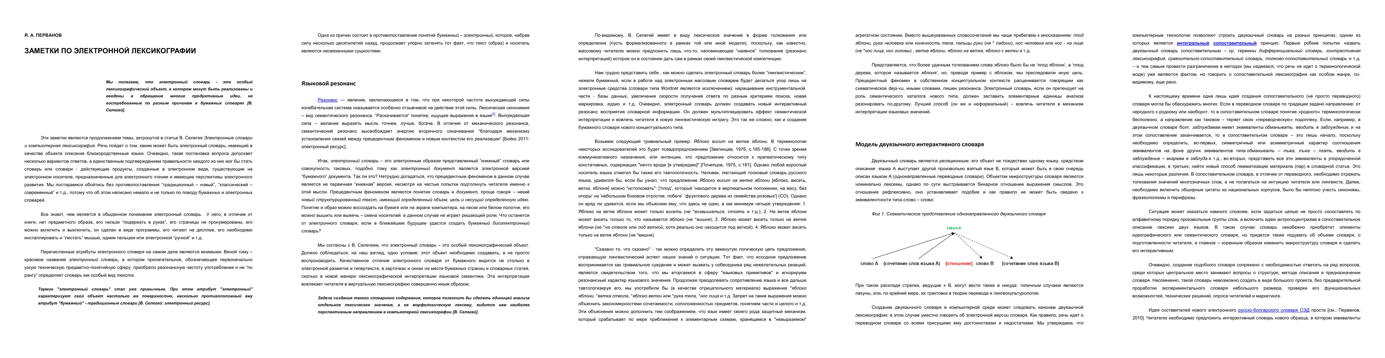 These notes are a continuation of topics covered by V. Selegej in his article "Electronic Dictionaries and Computational lexicography". How can an electronic dictionary have as its object the description of closely related languages? Obviously, such a question allows multiple answers.