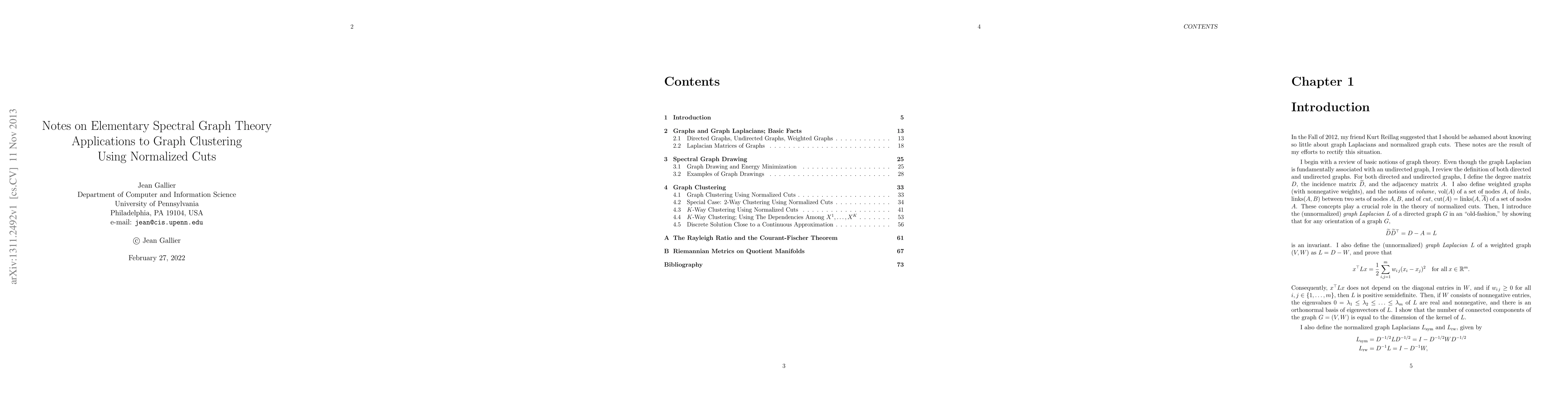 These are notes on the method of normalized graph cuts and its applications to graph clustering. I provide a fairly thorough treatment of this deeply original method due to Shi and Malik, including complete proofs. I include the necessary background on graphs and graph Laplacians. I then explain in detail how the eigenvectors of the graph Laplacian can be used to draw a graph. This is an attractive application of graph Laplacians. The main thrust of this paper is the method of normalized cuts. I give a detailed account for K = 2 clusters, and also for K > 2 clusters, based on the work of Yu and Shi. Three points that do not appear to have been clearly articulated before are elaborated: 1. The solutions of the main optimization problem should be viewed as tuples in the K-fold cartesian product of projective space RP^{N-1}. 2. When K > 2, the solutions of the relaxed problem should be viewed as elements of the Grassmannian G(K,N). 3. Two possible Riemannian distances are available to compare the closeness of solutions: (a) The distance on (RP^{N-1})^K. (b) The distance on the Grassmannian. I also clarify what should be the necessary and sufficient conditions for a matrix to represent a partition of the vertices of a graph to be clustered.