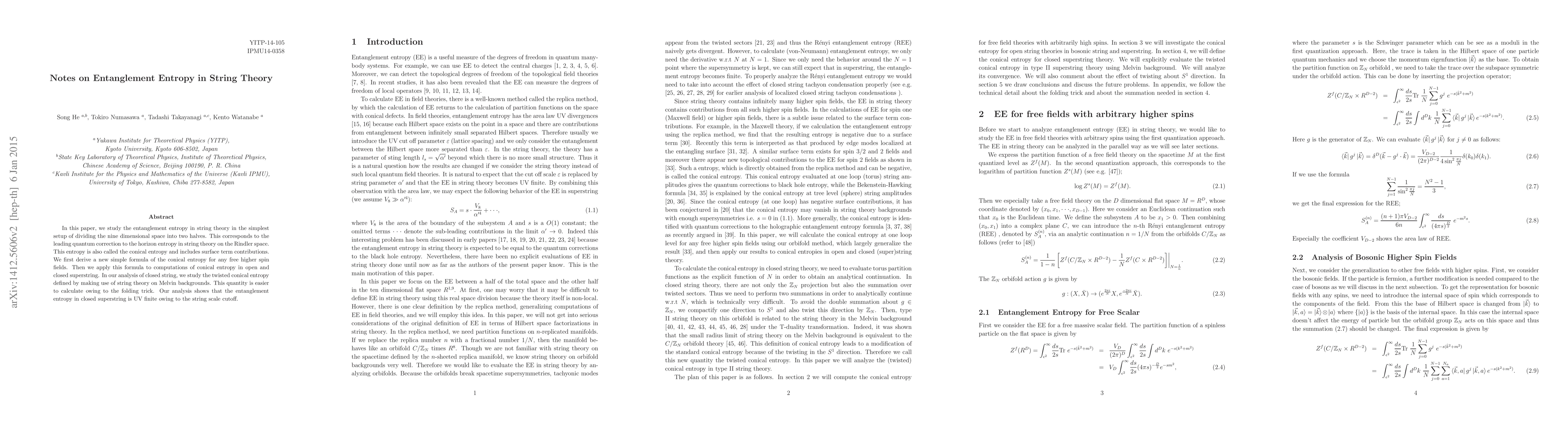This paper derives a new formula for conical entropy in string theory, applying it to both open and closed superstrings. It finds that the entanglement entropy in closed superstring is UV finite due to the string scale cutoff, facilitated by the twisted conical entropy computation on Melvin backgrounds.