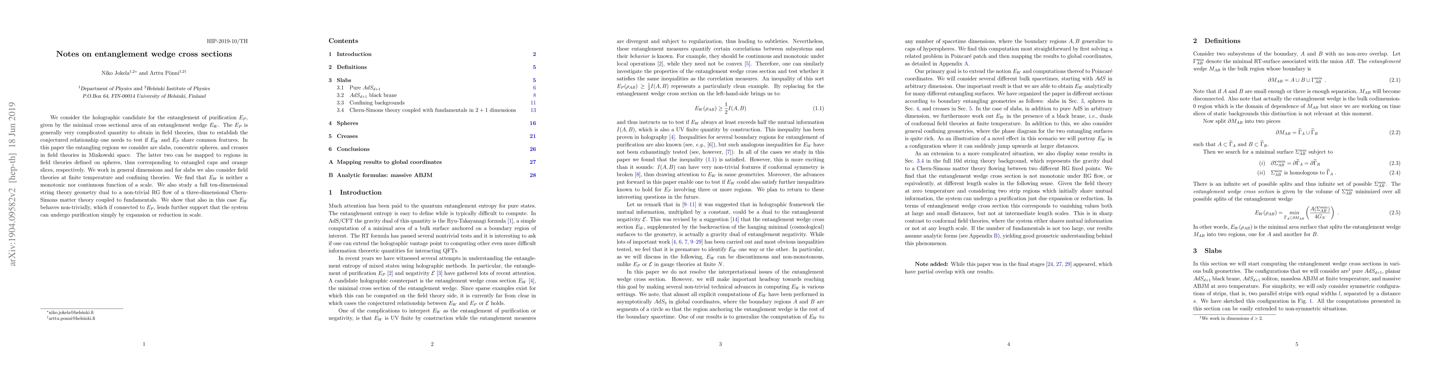 We consider the holographic candidate for the entanglement of purification $E_P$, given by the minimal cross sectional area of an entanglement wedge $E_W$. The $E_P$ is generally very complicated quantity to obtain in field theories, thus to establish the conjectured relationship one needs to test if $E_W$ and $E_P$ share common features. In this paper the entangling regions we consider are slabs, concentric spheres, and creases in field theories in Minkowski space. The latter two can be mapped to regions in field theories defined on spheres, thus corresponding to entangled caps and orange slices, respectively. We work in general dimensions and for slabs we also consider field theories at finite temperature and confining theories. We find that $E_W$, similarly to holographic mutual information, is not a monotonic function of a scale. We also study a full ten-dimensional string theory geometry dual to a non-trivial RG flow of a three-dimensional Chern-Simons matter theory coupled to fundamentals. We show that also in this case $E_W$ behaves non-trivially, which if connected to $E_P$, lends further support that the system can undergo purification simply by expansion or reduction in scale.