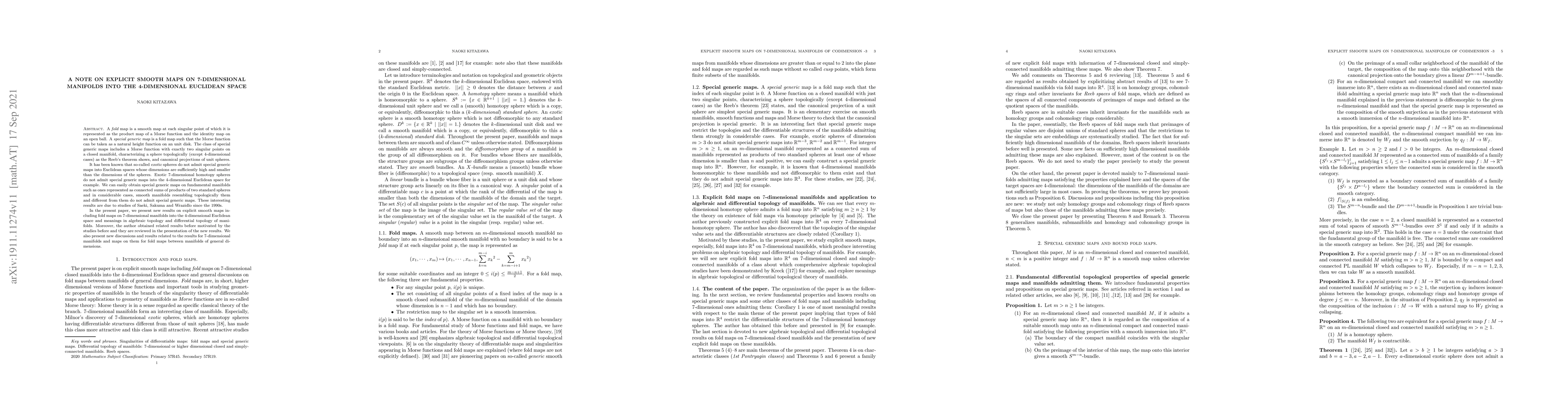 This paper investigates explicit smooth maps, specifically fold maps, from 7-dimensional manifolds into 4-dimensional Euclidean space, exploring their implications in algebraic and differential topology. It builds on prior work by Saeki, Sakuma, and Wrazidlo, highlighting that exotic 7-dimensional spheres lack such maps and presenting new findings on the subject.