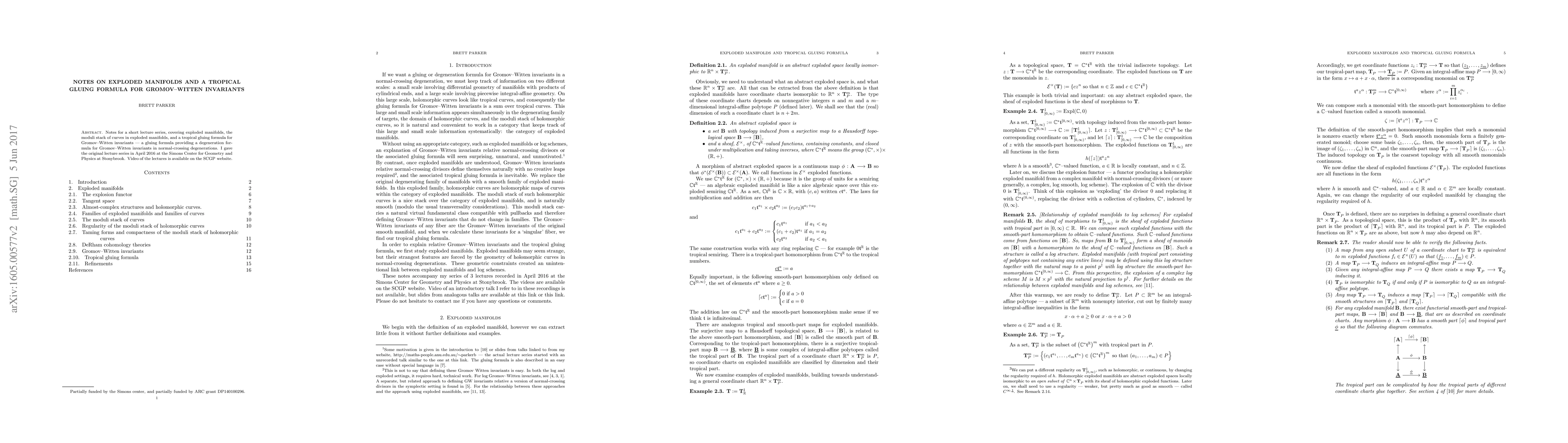 Notes for a short lecture series, covering exploded manifolds, the moduli stack of curves in exploded manifolds, and a tropical gluing formula for Gromov-Witten invariants: a gluing formula providing a degeneration formula for Gromov-Witten invariants in normal-crossing degenerations. I gave the original lecture series in April 2016 at the Simons Center for Geometry and Physics at Stonybrook. Video of the lectures is available on the SCGP website, http://scgp.stonybrook.edu/video_portal/video.php?id=2595