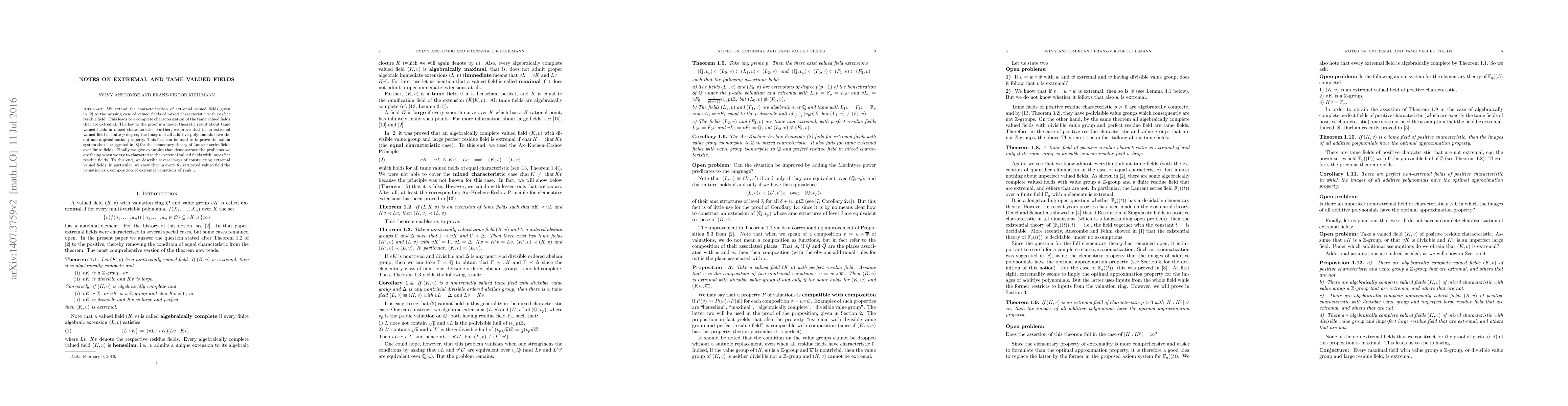 The paper introduces a model-theoretic result about tame valued fields in mixed characteristic and proves a complete characterization of tame valued fields that are extremal, extending previous work to mixed characteristic with perfect residue fields.
