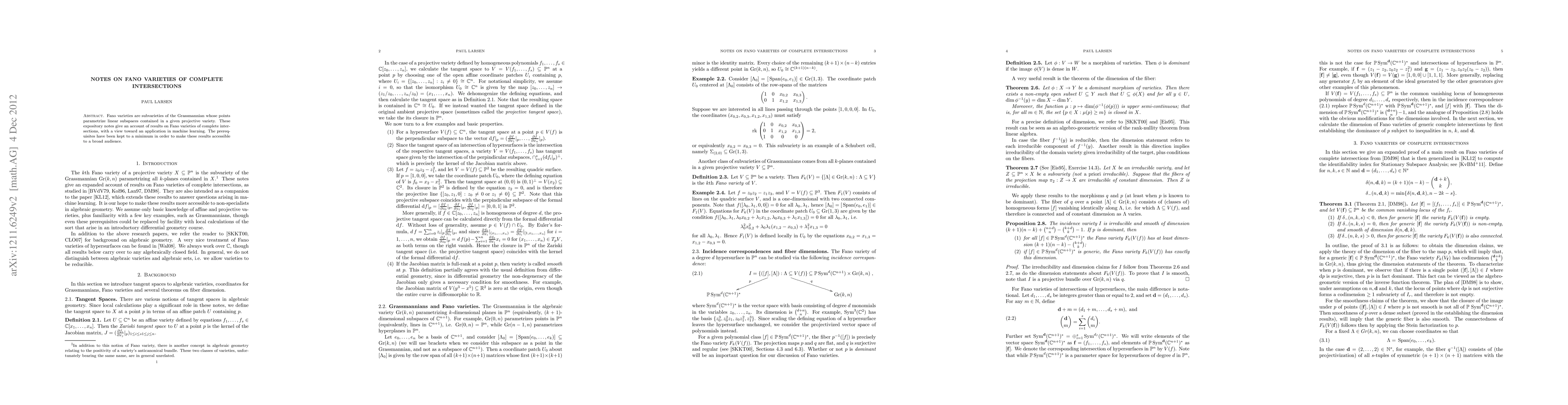 Summary: This paper provides an accessible overview of Fano varieties associated with complete intersections, focusing on their properties and potential applications in machine learning, with minimal prerequisites for a broad audience.