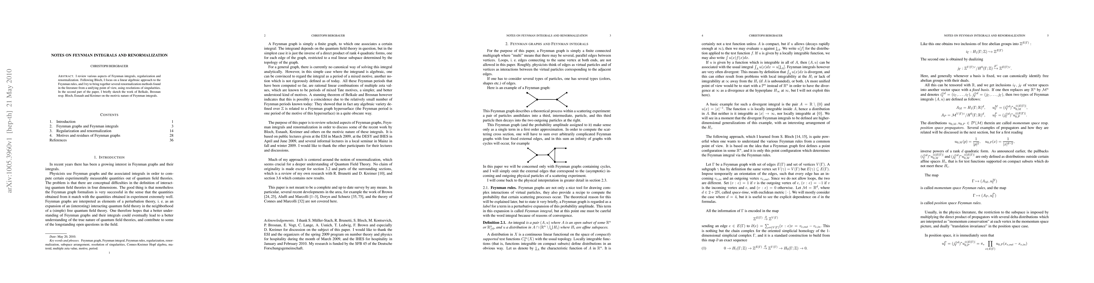 I review various aspects of Feynman integrals, regularization and renormalization. Following Bloch, I focus on a linear algebraic approach to the Feynman rules, and I try to bring together several renormalization methods found in the literature from a unifying point of view, using resolutions of singularities. In the second part of the paper, I briefly sketch the work of Belkale, Brosnan resp. Bloch, Esnault and Kreimer on the motivic nature of Feynman integrals.