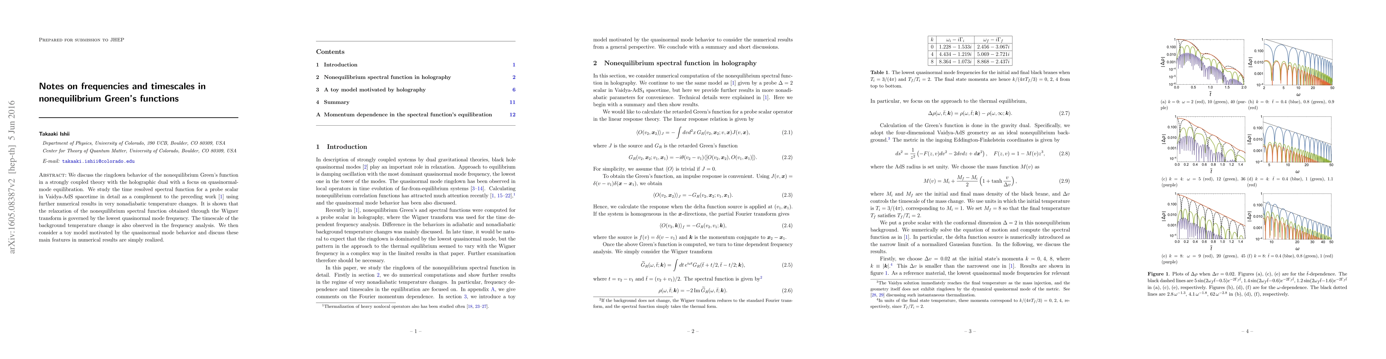 We discuss the ringdown behavior of the nonequilibrium Green's function in a strongly coupled theory with the holographic dual with a focus on quasinormal-mode equilibration. We study the time resolved spectral function for a probe scalar in Vaidya-AdS spacetime in detail as a complement to the preceding work arXiv:1603.06935 using further numerical results in very nonadiabatic temperature changes. It is shown that the relaxation of the nonequilibrium spectral function obtained through the Wigner transform is governed by the lowest quasinormal mode frequency. The timescale of the background temperature change is also observed in the frequency analysis. We then consider a toy model motivated by the quasinormal mode behavior and discuss these main features in numerical results are simply realized.