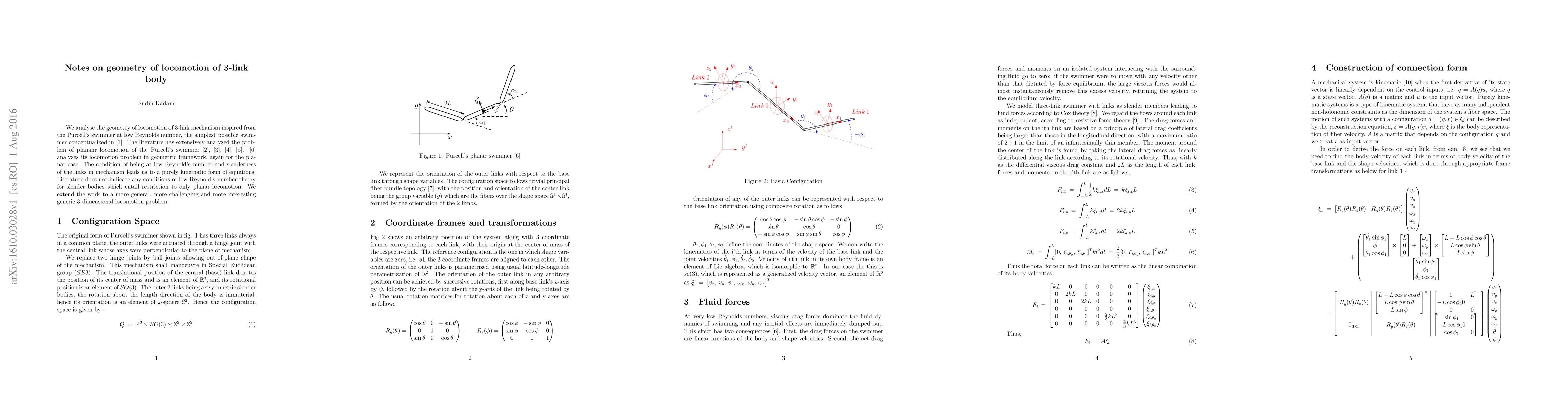 We present a generalized, 3 dimensional version of the Purcell's swimmer which is a planar mechanism locomoting at low Reynlods number regime. We use Cox theory and resistive force theory to come up with the forces acting on the system. We finally come up with a purely kinematic form of the system's equations.