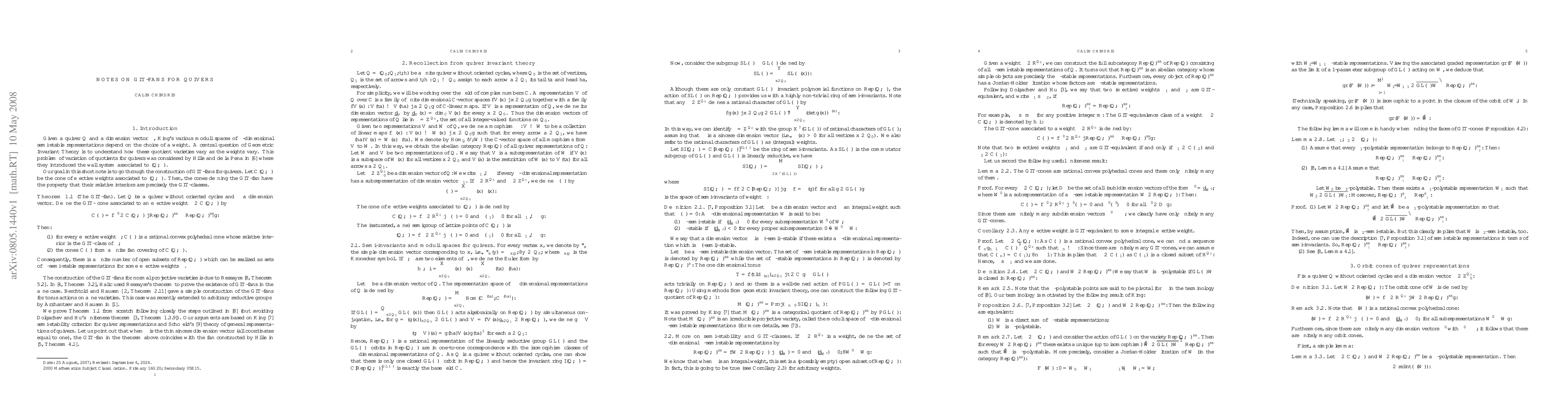 These are notes on the construction of the GIT-fans for quivers without oriented cycles. We follow closely the steps outlined by N. Ressayre in "The GIT-Equivalence for G-Line Bundles" (Geometriae Dedicata, Volume 81, Numbers 1-3, 2000). A simple construction of the GIT-fan for normal, affine G-varities has been recently given by Ivan V. Arzhantsev and Juergen Hausen in "Geometric Invariant Theory via Cox Rings"