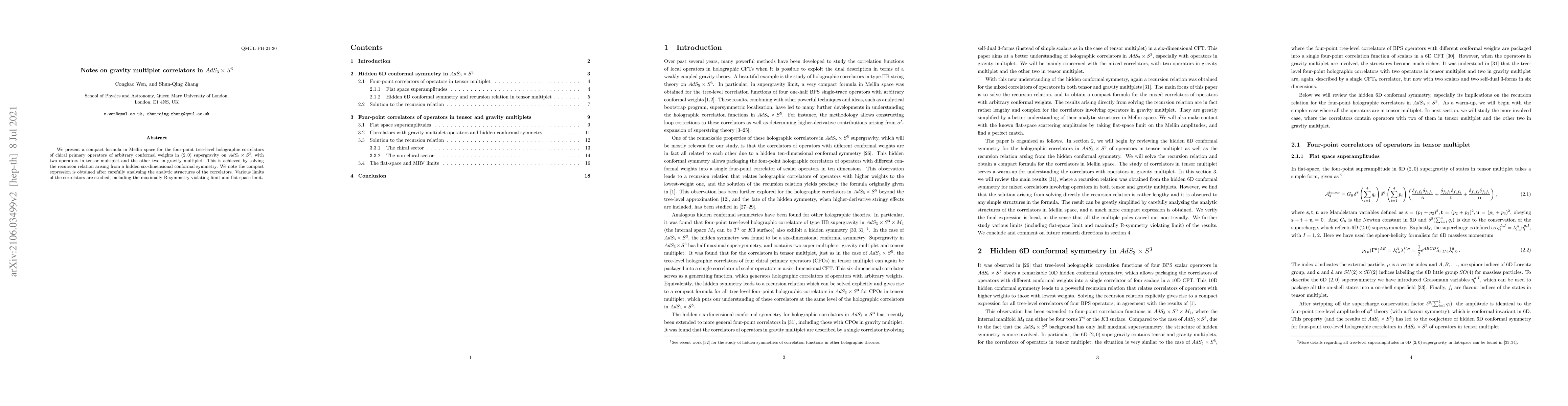This paper derives a concise formula in Mellin space for four-point correlators of chiral primary operators in $(2,0)$ supergravity on $AdS_3 \times S^3$, focusing on gravity multiplets. The result leverages a hidden six-dimensional conformal symmetry and explores various limits, including maximally R-symmetry violating and flat-space scenarios.