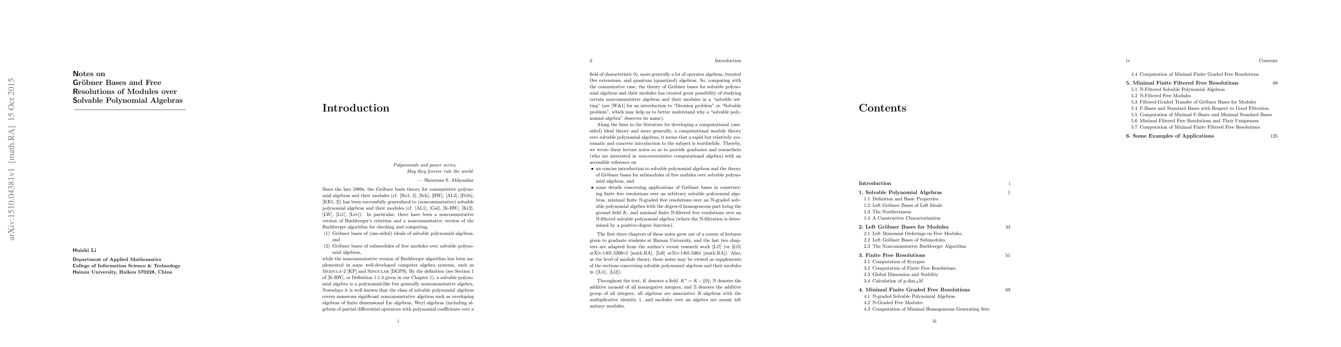 This text consists of five relatively systematic notes on Gr\"obner bases and free resolutions of modules over solvable polynomial algebras.