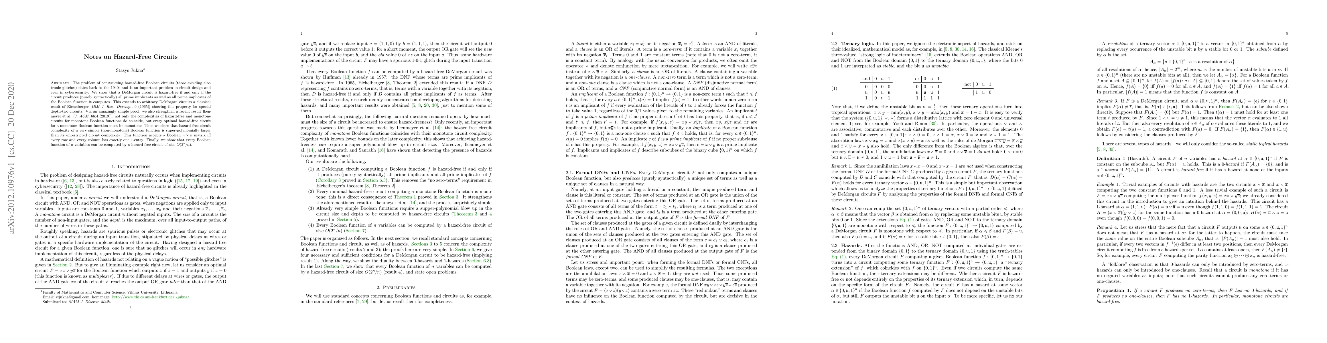 Researchers prove that DeMorgan circuits are hazard-free if they produce prime implicants and implicates of a Boolean function, extending a 1965 result to arbitrary depth-two circuits. They also show that every optimal hazard-free circuit for a monotone Boolean function must be monotone.