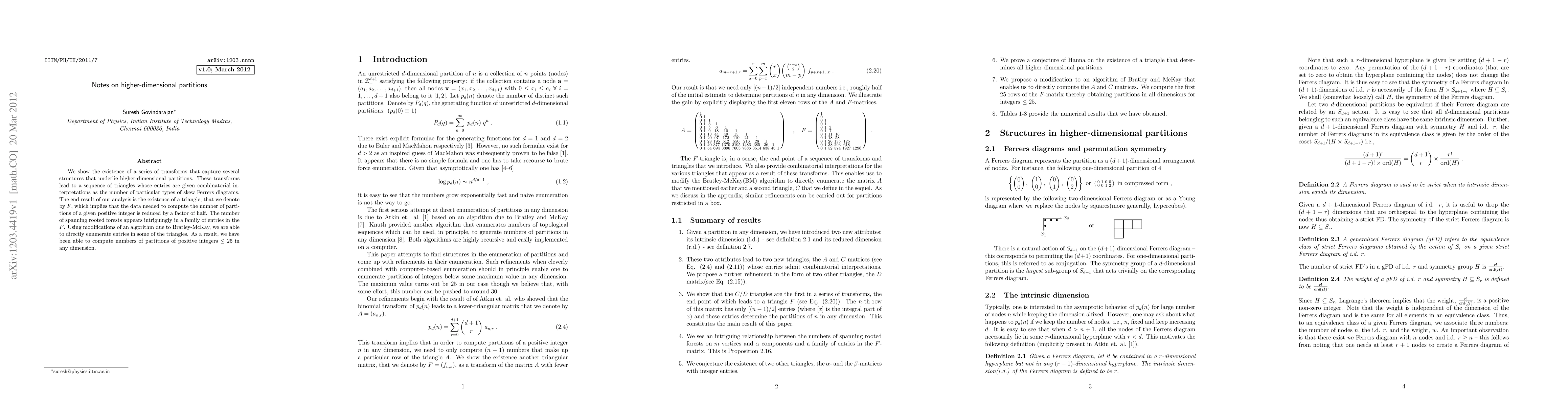This paper introduces transforms that reveal structures in higher-dimensional partitions, leading to a triangle F that reduces partition computation by half. It also enumerates partitions of integers up to 25 using modified Bratley-McKay algorithms, noting the appearance of spanning rooted forests in triangle F.