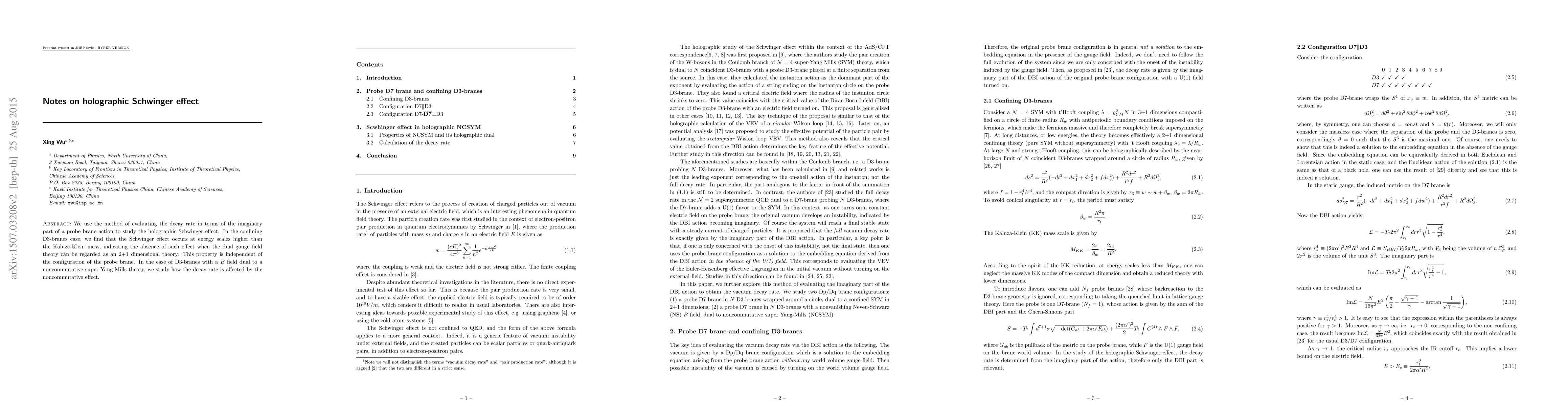 Summary: This paper explores the holographic Schwinger effect using probe brane action, finding that the effect does not occur at energy scales higher than the Kaluza-Klein mass in confining D3-branes, and investigates the impact of noncommutative effects on decay rates in dual noncommutative super Yang-Mills theory.