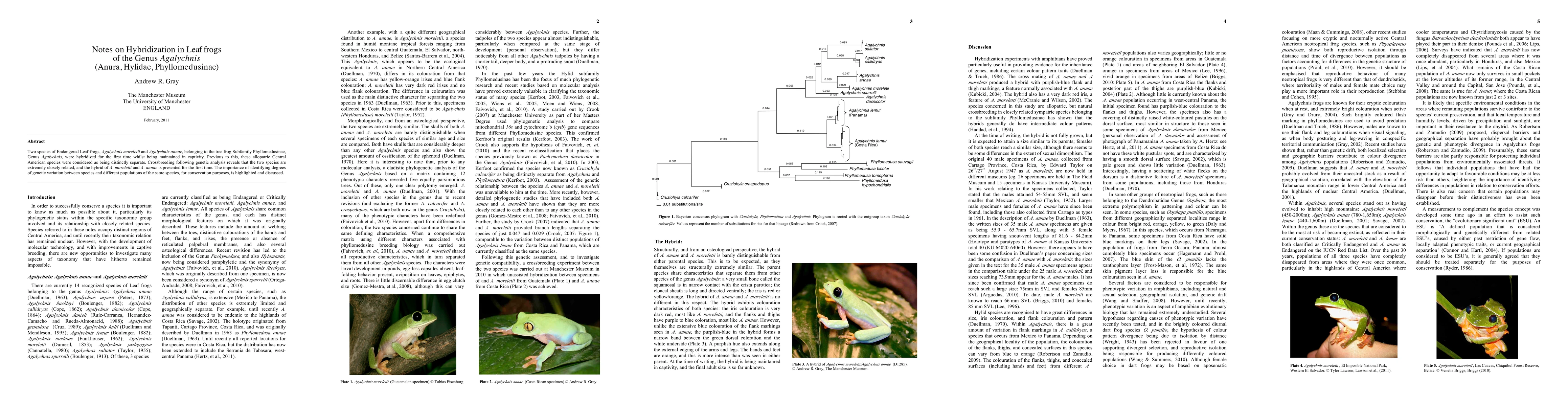 Two species of Endangered Leaf frogs, Agalychnis moreletii and Agalychnis annae, belonging to the tree frog Subfamily Phyllomedusinae, Genus Agalychnis, were hybridized for the first time whilst being maintained in captivity. Previous to this, these allopatric Central American species were considered as being distinctly separate. Crossbreeding following genetic analysis reveals that the two species are extremely closely related, and the hybrid of A. moreletii and A. annae is presented for the first time. The importance of identifying degrees of genetic variation between species and different populations of the same species, for conservation purposes, is highlighted and discussed.