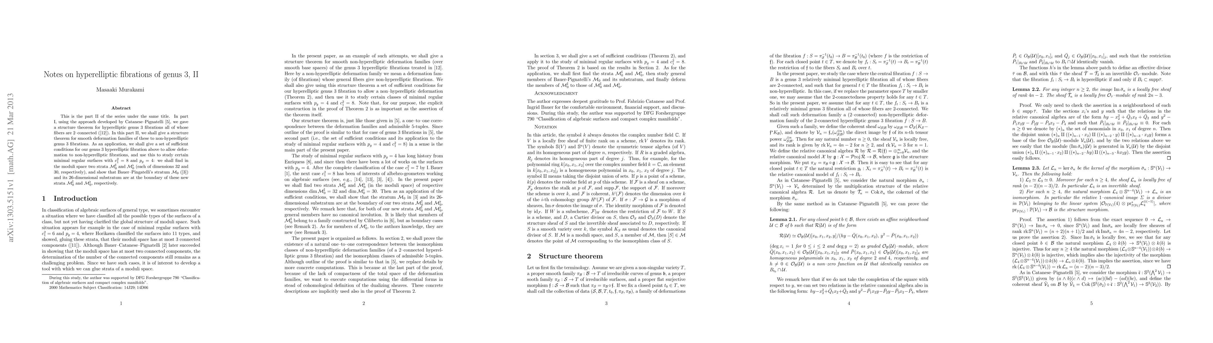 This is the part II of the series under the same title. In part I, using the approach developed by Catanese--Pignatelli arXiv:math/0503294, we gave a structure theorem for hyperelliptic genus 3 fibrations all of whose fibers are 2-connected (arXiv:1209.6278 [math.AG]). In this part II, we shall give a structure theorem for smooth deformation families of these to non-hyperelliptic genus 3 fibrations. As an application, we shall give a set of sufficient conditions for our genus 3 hyperelliptic fibration above to allow deformation to non-hyperelliptic fibrations, and use this to study certain minimal regular surfaces with first Chern number 8 and geometric genus 4: we shall find in the moduli space two strata M_0^{sharp} and M_0^{flat}$ (each of dimensions 32 and 30, respectively), and show that Bauer--Pingatelli's stratum M_0 (arXiv:math/0603094) and its 26-dimensional substratum are at the boundary of these new strata M_0^{sharp} and M_0^{flat}, respectively.