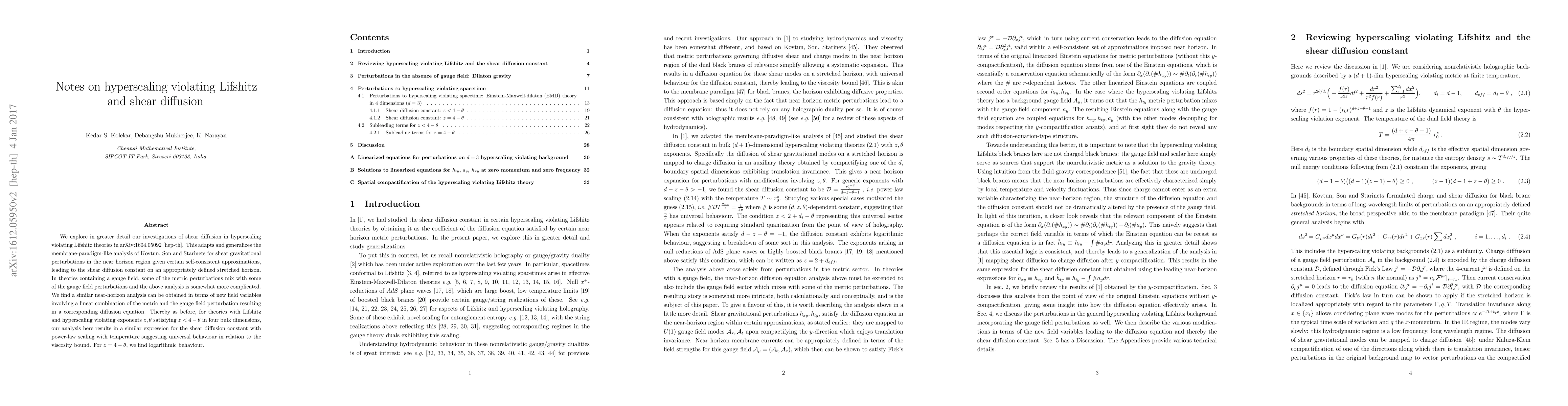 We explore in greater detail our investigations of shear diffusion in hyperscaling violating Lifshitz theories in arXiv:1604.05092 [hep-th]. This adapts and generalizes the membrane-paradigm-like analysis of Kovtun, Son and Starinets for shear gravitational perturbations in the near horizon region given certain self-consistent approximations, leading to the shear diffusion constant on an appropriately defined stretched horizon. In theories containing a gauge field, some of the metric perturbations mix with some of the gauge field perturbations and the above analysis is somewhat more complicated. We find a similar near-horizon analysis can be obtained in terms of new field variables involving a linear combination of the metric and the gauge field perturbation resulting in a corresponding diffusion equation. Thereby as before, for theories with Lifshitz and hyperscaling violating exponents $z, \theta$ satisfying $z<4-\theta$ in four bulk dimensions, our analysis here results in a similar expression for the shear diffusion constant with power-law scaling with temperature suggesting universal behaviour in relation to the viscosity bound. For $z=4-\theta$, we find logarithmic behaviour.